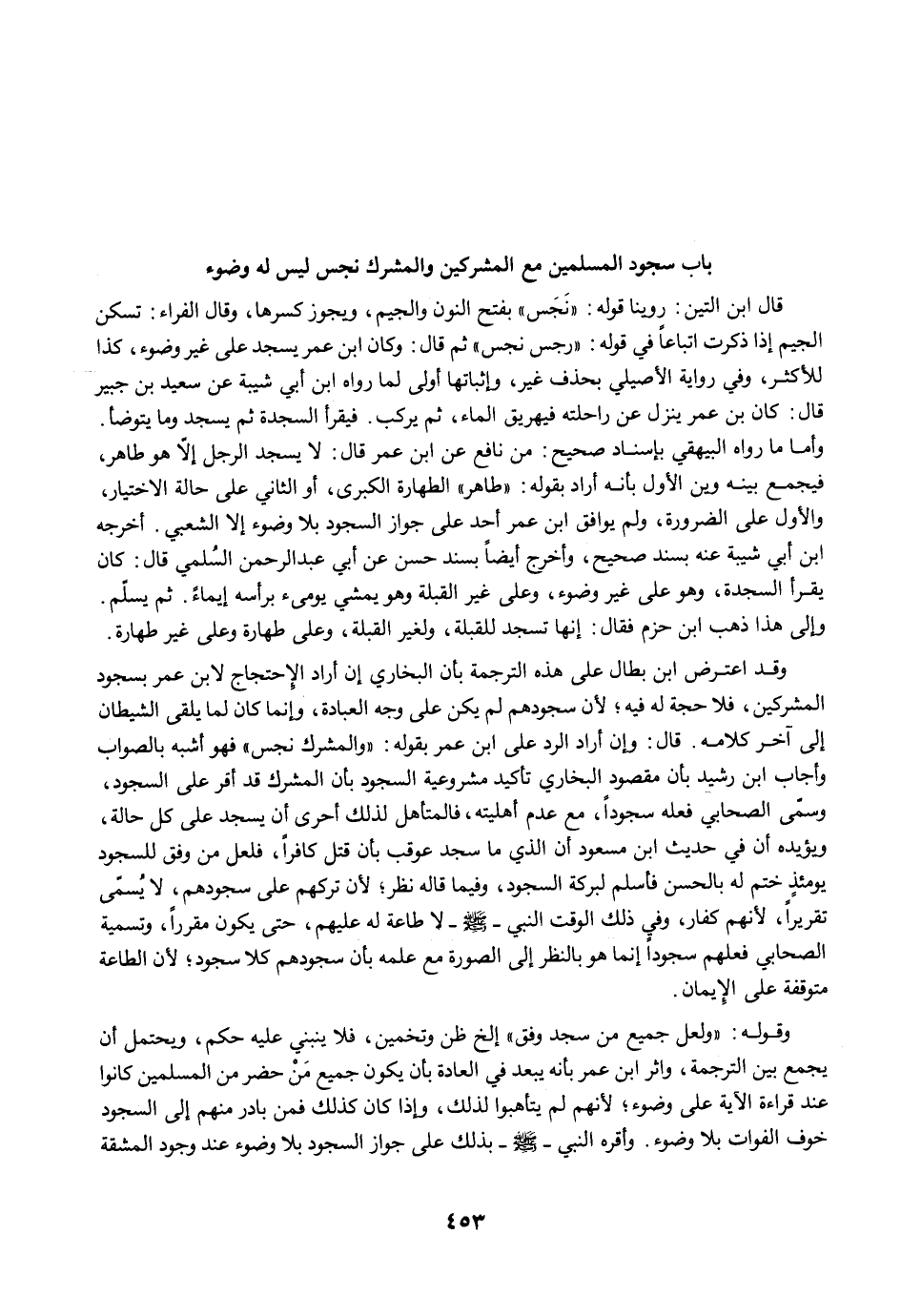 وقد اعترض ابن بطال على هذه الترجمة بأن البخاري إن أراد الإحتجاج لابن عمر بسجود المشركين، فلا حجة له فيه؛ لأن سجودهم لم يكن على وجه العبادة، وإنما كان لما يلقى الشيطان إلى آخر كلامه. قال: وإن أراد الرد على ابن عمر بقوله: "والمشرك نجس" فهو أشبه بالصواب وأجاب ابن رشيد بأن مقصود البخاري تأكيد مشروعية السجود بأن المشرك قد أقر على السجود، وسمّى الصحابي فعله سجودًا، مع عدم أهليته، فالمتأهل لذلك أحرى أن يسجد على كل حالة، ويؤيده أن في حديث ابن مسعود أن الذي ما سجد عوقب بأن قتل كافرًا، فلعل من وفق للسجود يومئذٍ ختم له بالحسن فأسلم لبركة السجود، وفيما قاله نظر؛ لأن تركهم على سجودهم، لا يُسمّى تقريرًا؛ لأنهم كفار، وفي ذلك الوقت النبي -صلى الله عليه وسلم- لا طاعة له عليهم، حتى يكون مقررًا، وتسمية الصحابي فعلهم سجودًا إنما هو بالنظر إلى الصورة مع علمه بأن سجودهم كلا سجود؛ لأن الطاعة متوقفة على الإيمان.