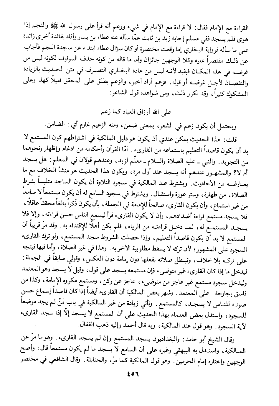 قلت: هذا الحديث يمكن عندي أن يكون هو دليل المالكية في اشتراطهم كون المستمع لا بد أن يكون قاصدًا التعليم باستماعه من القارىء. أمّا القرآن وأحكامه من ادغام وإظهار ونحوهما من التجويد. والشعبي -عليه الصلاة والسلام- معلّم لزيد، وعندهم قولان في المعلم: هل يسجد أم لا؟ والمشهور عندهم أنه يسجد عند أول مرة، ويكون هذا الحديث هو منشأ الخلاف مع ما يعارضه من الأحاديث. ويشترط عند المالكية في سجود التلاوة أن يكون الساجد متلبسًا بشرط الصلاة، من طهارة، وستر عورة واستقبال. ويشترط في سجود السامع له أن يكون مستمعًا لا سامعًا من غير استماع، وأن يكون القارىء صالحًا للإِمامة في الجملة، بأن يكون ذَكرًا بالغًا محققًا عاقلًا، فلا يسجد مستمع قراءة أضدادهم، وأن لا يكون القارىء قرأ ليسمع الناس حسن قراءته، وإلا فلا يسجد المستمع له، لما دخل قراءته من الرياء، فلم يكن أهلا للإقتداء به. وقد مرَّ قريبًا أن المستمع لابد أن يكون قاصدًا التعليم، وإذا حصلت الشروط سجد المستمع، ولو ترك القارىء السجود على المشهور؛ لأن تركه لا يسقط مطلوبية الآخر به. وهذا في غير الصلاة، وأما فيها فيتجه على تركه بلا خلاف، وتبطل صلاته بفعلها دون إمامة دون العكس، وقولي سابقًا في الجملة: ليدخل ما إذا كان القارىء غير متوضىء فإن مستمعه يسجد على قول، وقيل لا يسجد وهو المعتمد وليدخل سجود مستمع غير عاجز من متوضىء، عاجز عن ركن، ومستمع مكروه الإِمامة، وكذا من فاسق بجارحة. على المعتمد. وشهر بعض المالكية أن القارىء أيضًا إذا كان قاصدًا إسماع حسن صوته للناس لا يسجد، كالمستمع. وتأتي زيادة من غير المالكية في باب مَنْ لم يجد موضعًا للسجود، واستدل بعض العلماء بهذا الحديث على أن المستمع لا يسجد إلاَّ إذا سجد القارىء لآية السجود. وهو قول عند المالكية، وبه قال أحمد وإليه ذهب القفال.