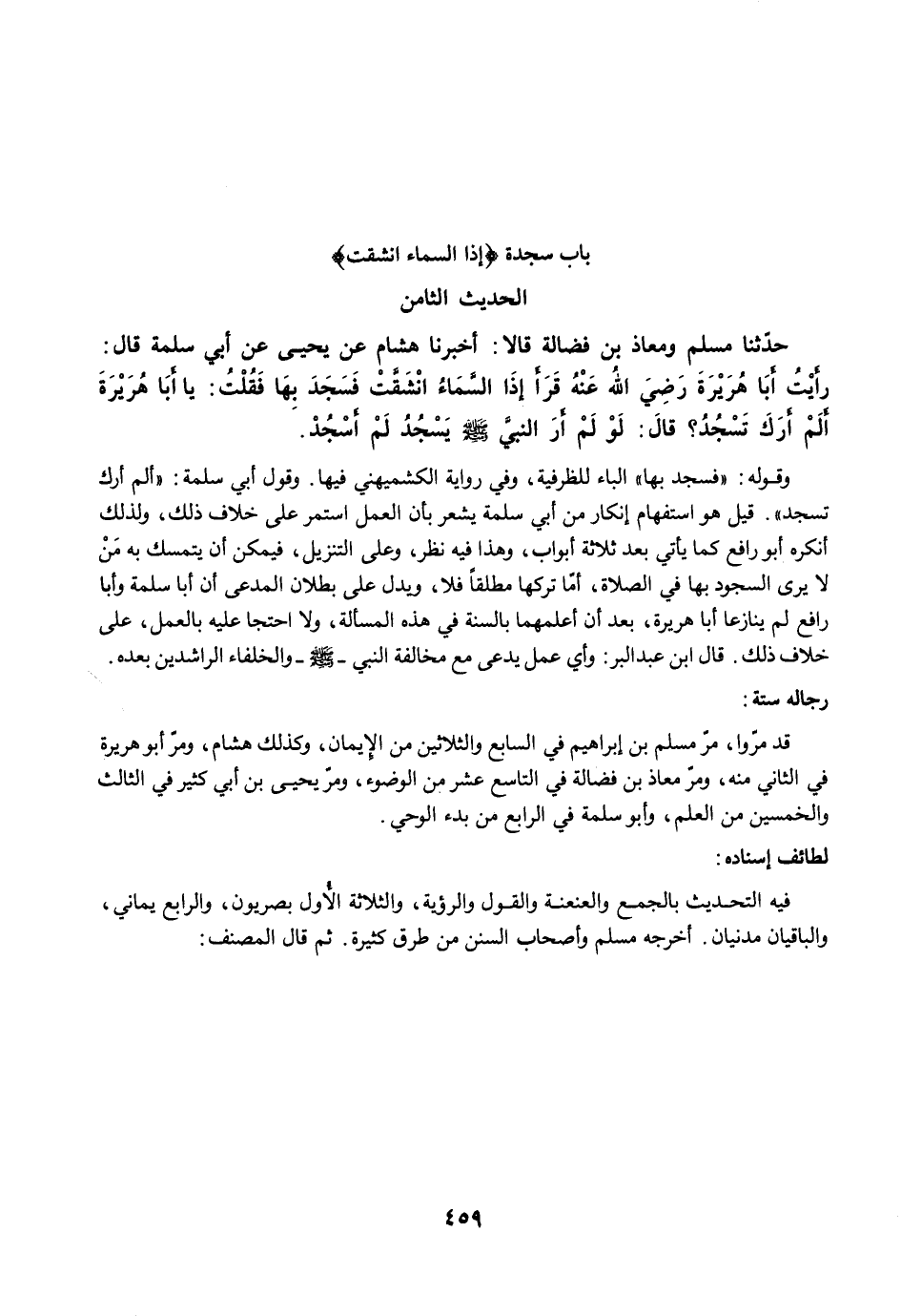 حَدَّثَنَا مُسْلِمٌ وَمُعَاذُ بْنُ فَضَالَةَ قَالاَ: أَخْبَرَنَا هِشَامٌ عَنْ يَحْيَى عَنْ أَبِي سَلَمَةَ قَالَ: رَأَيْتُ أَبَا هُرَيْرَةَ رضي الله عنه قَرَأَ {إِذَا السَّمَاءُ انْشَقَّتْ} فَسَجَدَ بِهَا فَقُلْتُ: يَا أَبَا هُرَيْرَةَ، أَلَمْ أَرَكَ تَسْجُدُ؟ قَالَ: لَوْ لَمْ أَرَ النَّبِيَّ -صلى الله عليه وسلم- يَسْجُدُ لَمْ أَسْجُدْ.