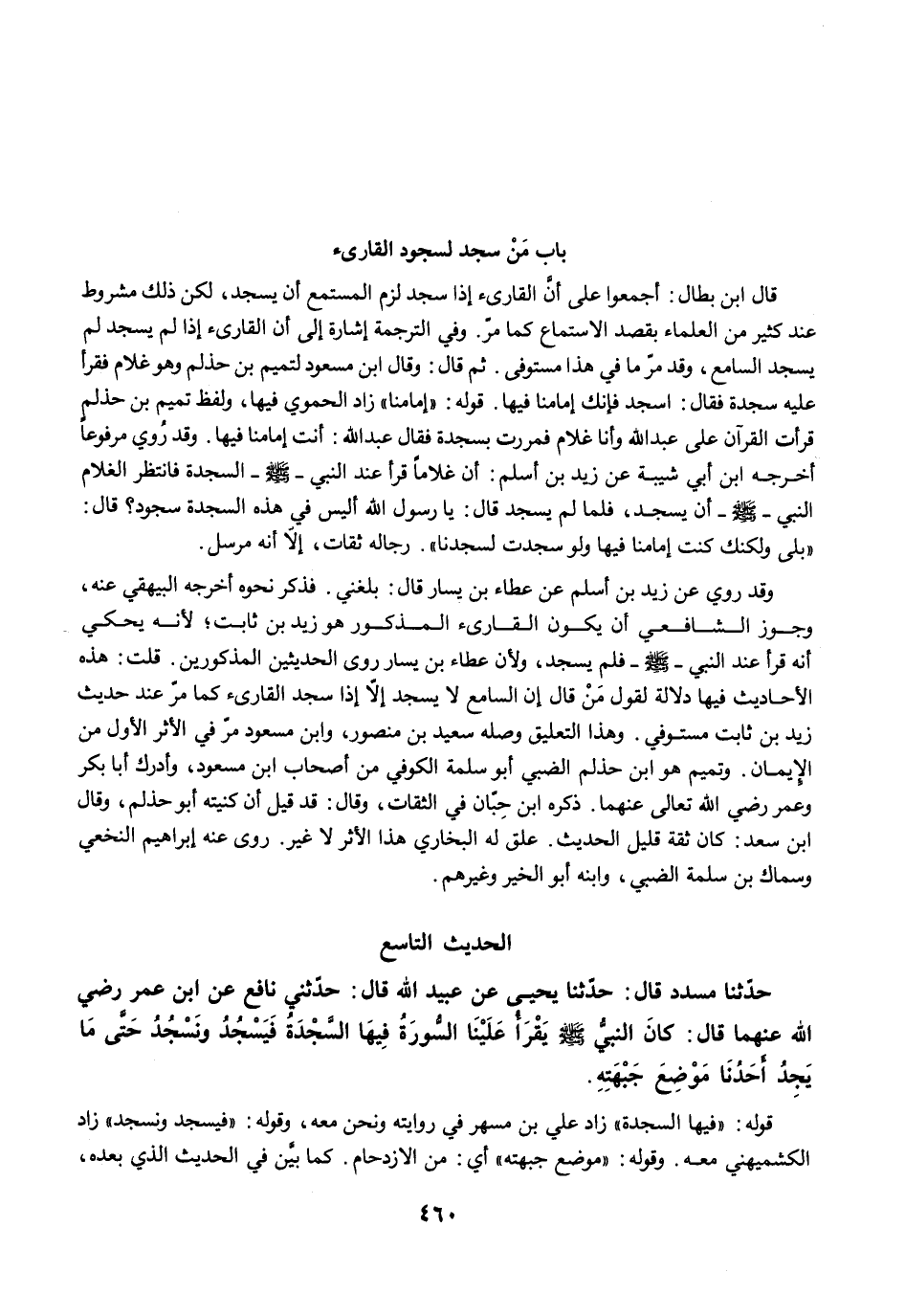 حَدَّثَنَا مُسَدَّدٌ قَالَ: حَدَّثَنَا يَحْيَى عَنْ عُبَيْدِ اللَّهِ قَالَ: حَدَّثَنِي نَافِعٌ عَنِ ابْنِ عُمَرَ رضي الله عنهما قَالَ: كَانَ النَّبِيُّ -صلى الله عليه وسلم- يَقْرَأُ عَلَيْنَا السُّورَةَ فِيهَا السَّجْدَةُ، فَيَسْجُدُ وَنَسْجُدُ، حَتَّى مَا يَجِدُ أَحَدُنَا مَوْضِعَ جَبْهَتِهِ.