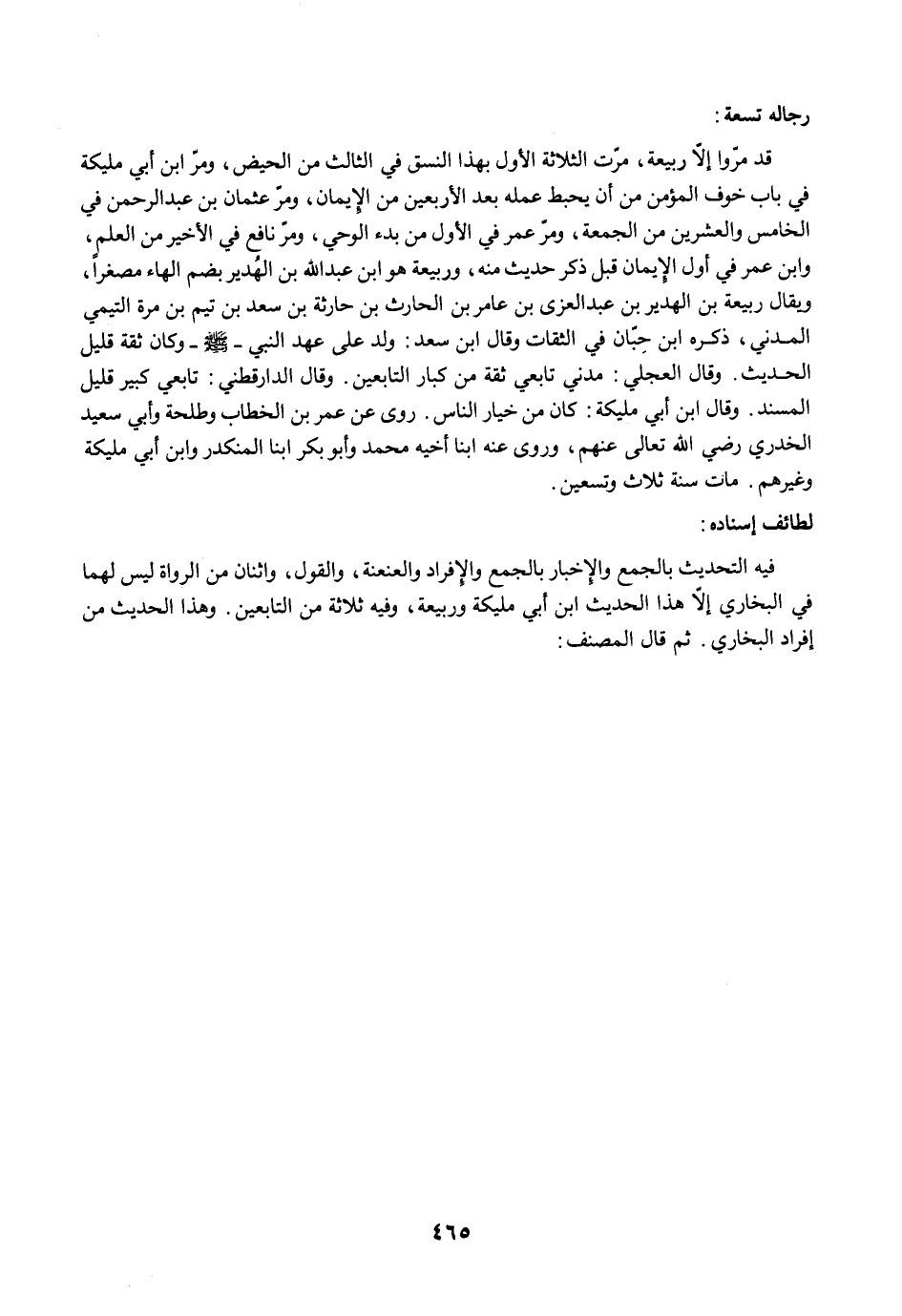 فيه التحديث بالجمع والإخبار بالجمع والإفراد والعنعنة، والقول، واثنان من الرواة ليس لهما في البخاري إلاَّ هذا الحديث ابن أبي مليكة وربيعة، وفيه ثلاثة من التابعين. وهذا الحديث من إفراد البخاري. ثم قال المصنف: