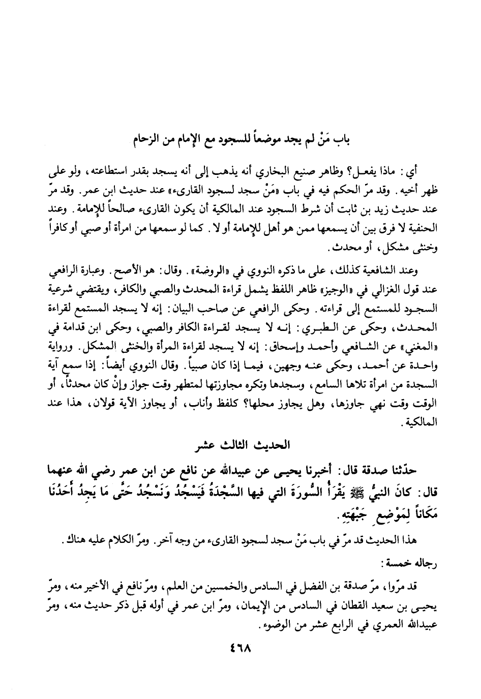 حَدَّثَنَا صَدَقَةُ قَالَ: أَخْبَرَنَا يَحْيَى عَنْ عُبَيْدِ اللَّهِ عَنْ نَافِعٍ عَنِ ابْنِ عُمَرَ رضي الله عنهما قَالَ: كَانَ النَّبِيُّ -صلى الله عليه وسلم- يَقْرَأُ السُّورَةَ الَّتِى فِيهَا السَّجْدَةُ فَيَسْجُدُ وَنَسْجُدُ حَتَّى مَا يَجِدُ أَحَدُنَا مَكَانًا لِمَوْضِعِ جَبْهَتِهِ.