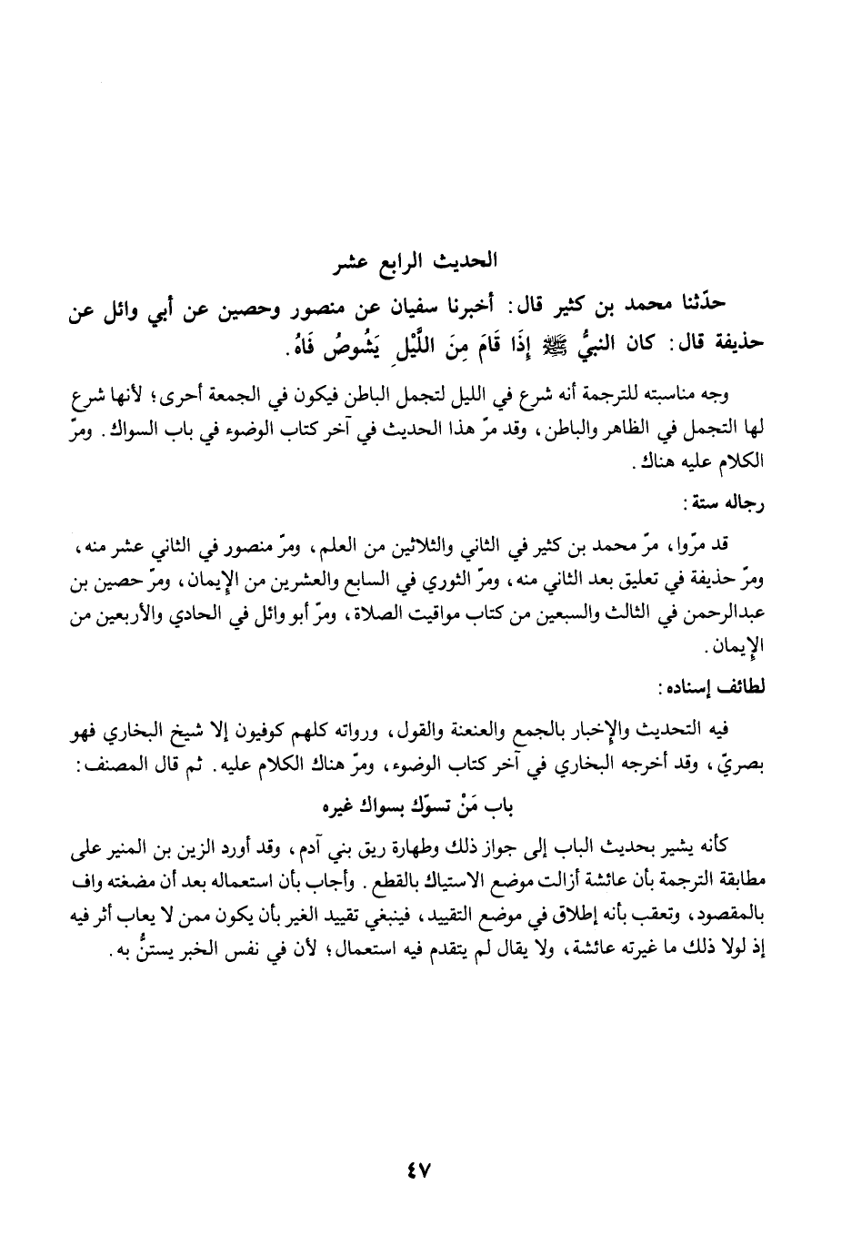 حَدَّثَنَا مُحَمَّدُ بْنُ كَثِيرٍ قَالَ: أَخْبَرَنَا سُفْيَانُ عَنْ مَنْصُورٍ وَحُصَيْنٍ عَنْ أَبِي وَائِلٍ عَنْ حُذَيْفَةَ قَالَ: كَانَ النَّبِيُّ -صلى الله عليه وسلم- إِذَا قَامَ مِنَ اللَّيْلِ يَشُوصُ فَاهُ.