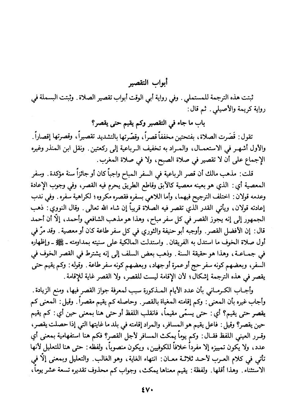 قلت: مذهب مالك أن قصر الرباعية في السفر المباح واجبًا كان أو جائزًا سنة مؤكدة. وسفر المعصية أي: الذي هو بعينه معصية كالآبق وقاطع الطريق يحرم فيه القصر، وفي وجوب الإعادة وعدمه قولان: اختلف الترجيح فيهما، وأما اللاهي بسفره فقصره مكروه؛ لكراهية سفره. وفي ندب إعادته قولان، ويأتي القدر الذي تقصر فيه الصلاة قريبًا إن شاء الله تعالى. وقال النووي: ذهب الجمهور إلى إنه يجوز القصر في كل سفر مباح، وهذا هو مذهب الشافعي وأحمد، إلاَّ أن أحمد قال: إن الأفضل القصر. وأوجبه أبو حنيفة والثوري في كل سفر طاعة كان أو معصية. وقد مرّ في أول صلاة الخوف ما استدل به الفريقان. واستدلت المالكية على سنيته بمداومته -صلى الله عليه وسلم- وإظهاره في جماعة، وهذا هو حقيقة السنة. وذهب بعض السلف إلى إنه يشترط في القصر الخوف في السفر، وبعضهم كونه سفر حج أو عمرة أو جهاد، وبعضهم كونه سفر طاعة. وقوله: وكم يقيم حتى يقصر في هذه الترجمة إشكال؛ لأن الإقامة ليست للقصر، ولا القصر غاية للإقامة.