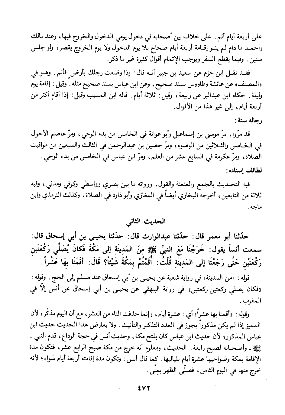 وقوله: "أقمنا بها عشرًا" أي: عشرة أيام، وإنما حذفت التاء من العشر، مع أن اليوم مذكّر، لأن المميز إذا لم يكن مذكورًا يجوز في العدد التذكير والتأنيث. ولا يعارض هذا الحديث حديث ابن عباس المذكور؛ لأن حديث ابن عباس كان بفتح مكة، وحديث أنس في حجة الوداع، قدم النبي -صلى الله عليه وسلم- وأصحابه لصبح رابعة. الحديث، ومعلوم أنه خرج من مكة صبح الرابع عشر، فتكون مدة الإقامة بمكة وضواحيها عشرة أيام بلياليها. كما قال أنس: وتكون مدة إقامته أربعة أيام سَواء؛ لأنه خرج منها في اليوم الثامن، فصلّى الظهر بمِنًى.