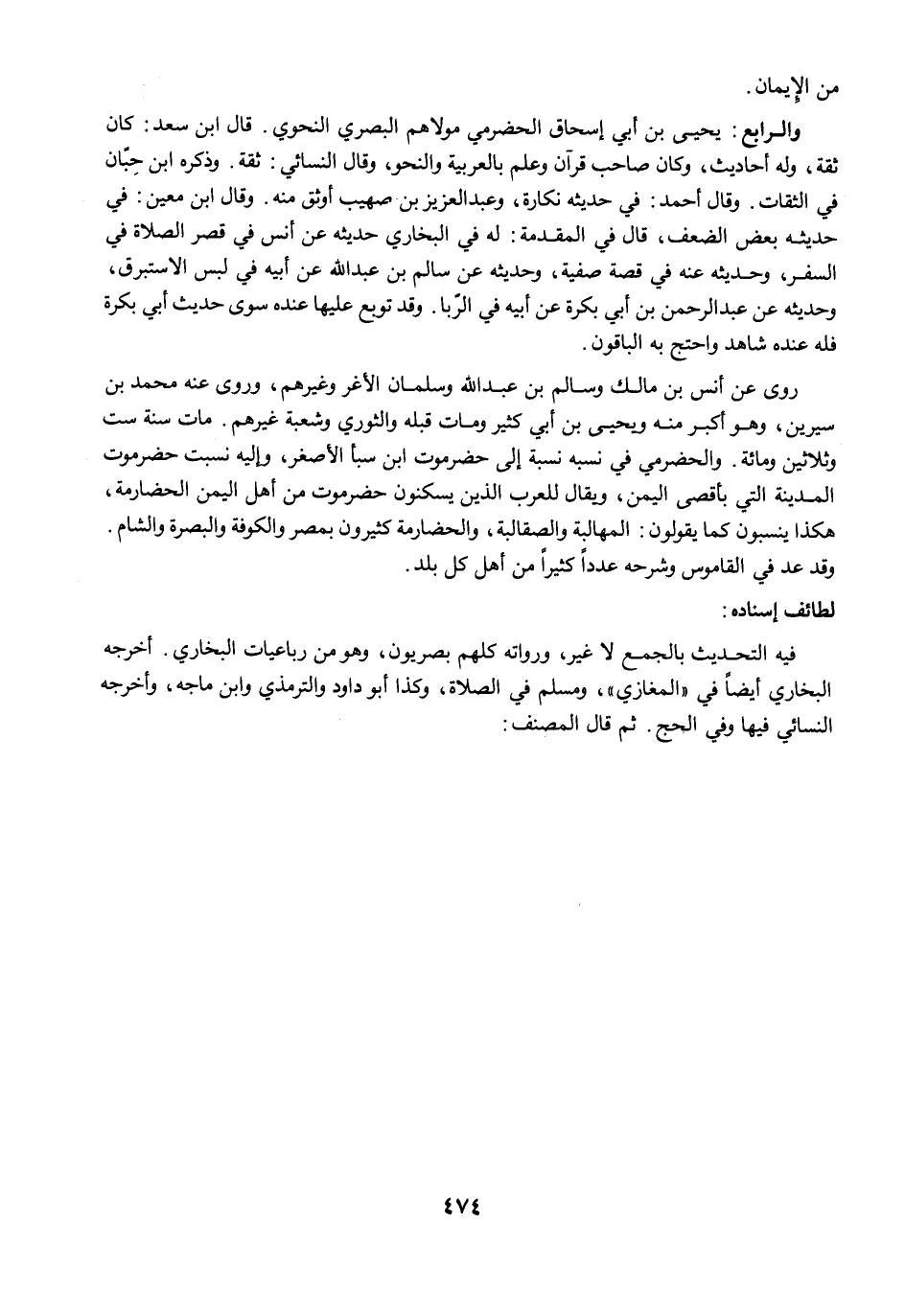 والرابع: يحيى بن أبي إسحاق الحضرمي مولاهم البصري النحوي. قال ابن سعد: كان ثقة، وله أحاديث، وكان صاحب قرآن وعلم بالعربية والنحو، وقال النسائي: ثقة. وذكره ابن حِبّان في الثقات. وقال أحمد: في حديثه نكارة، وعبد العزيز بن صهيب أوثق منه. وقال ابن معين: في حديثه بعض الضعف، قال في المقدمة: له في البخاري حديثه عن أنس في قصر الصلاة في السفر، وحديثه عنه في قصة صفية، وحديثه عن سالم بن عبد الله عن أبيه في لبس الاستبرق، وحديثه عن عبد الرحمن بن أبي بكرة عن أبيه في الربا. وقد توبع عليها عنده سوى حديث أبي بكرة فله عنده شاهد واحتج به الباقون.