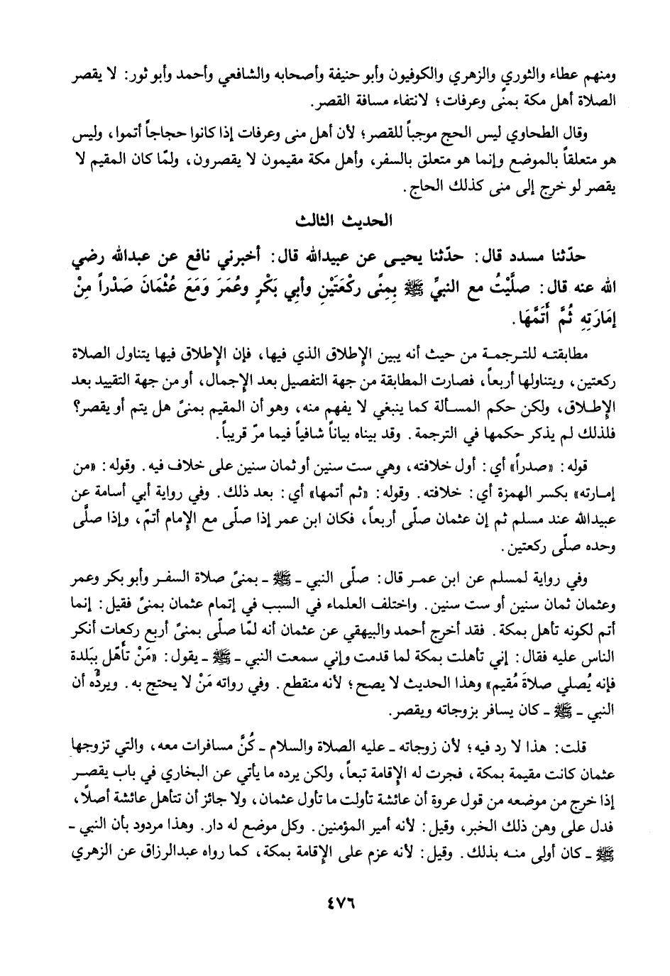 حَدَّثَنَا مُسَدَّدٌ قَالَ: حَدَّثَنَا يَحْيَى عَنْ عُبَيْدِ اللَّهِ قَالَ: أَخْبَرَنِي نَافِعٌ عَنْ عَبْدِ اللَّهِ رضي الله عنه قَالَ: صَلَّيْتُ مَعَ النَّبِيِّ -صلى الله عليه وسلم- بِمِنًى رَكْعَتَيْنِ، وَأَبِى بَكْرٍ وَعُمَرَ، وَمَعَ عُثْمَانَ صَدْرًا مِنْ إِمَارَتِهِ ثُمَّ أَتَمَّهَا.