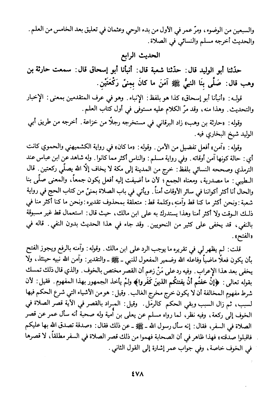 قلت: لم يظهر لي في تقريره ما يوجب الرد على ابن مالك. وقوله: وآمنه بالرفع ويجوز الفتح بأن يكون فعلاً ماضيًا وفاعله الله وضمير المفعول للنبي -صلى الله عليه وسلم- والتقدير: وآمن الله نبيه حينئذ، ولا يخفى بعد هذا الإعراب. وفيه رد على مَنْ زعم أن القصر مختص بالخوف. والذي قال ذلك تمسك بقوله تعالى: {إِنْ خِفْتُمْ أَنْ يَفْتِنَكُمُ الَّذِينَ كَفَرُوا} ولمْ يأخذ الجمهور بهذا المفهوم. فقيل: لأن شرط مفهوم المخالفة أن لا يكون خرج مخرج الغالب. وقيل: هو من الأشياء التي شرع الحكم فيها لسبب، ثم زال السبب وبقي الحكم كالرمل. وقيل: المراد بالقصر في الآية قصر الصلاة في الخوف إلى ركعة، وفيه نظر، لما رواه مسلم عن يعلي بن أُمية وله صحبة أنه سأل عمر عن قصر الصلاة في السفر، فقال: إنه سأل رسول الله -صلى الله عليه وسلم- عن ذلك فقال: "صدقة تصدق الله بها عليكم فاقبلوا صدقته" فهذا ظاهر في أن الصحابة فهموا من ذلك قصر الصلاة في السفر مطلقًا، لا قصرها في الخوف خاصة، وفي جواب عمر إشارة إلى القول الثاني.