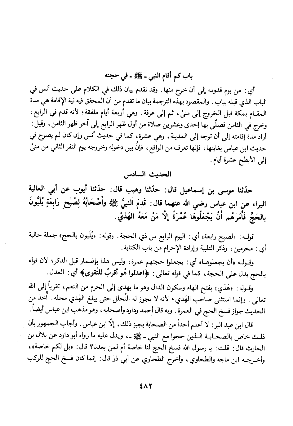 حَدَّثَنَا مُوسَى بْنُ إِسْمَاعِيلَ قَالَ: حَدَّثَنَا وُهَيْبٌ قَالَ: حَدَّثَنَا أَيُّوبُ عَنْ أَبِي الْعَالِيَةِ الْبَرَّاءِ عَنِ ابْنِ عَبَّاسٍ رضي الله عنهما قَالَ: قَدِمَ النَّبِيُّ -صلى الله عليه وسلم- وَأَصْحَابُهُ لِصُبْحِ رَابِعَةٍ يُلَبُّونَ بِالْحَجِّ، فَأَمَرَهُمْ أَنْ يَجْعَلُوهَا عُمْرَةً إِلاَّ مَنْ مَعَهُ الْهَدْيُ.