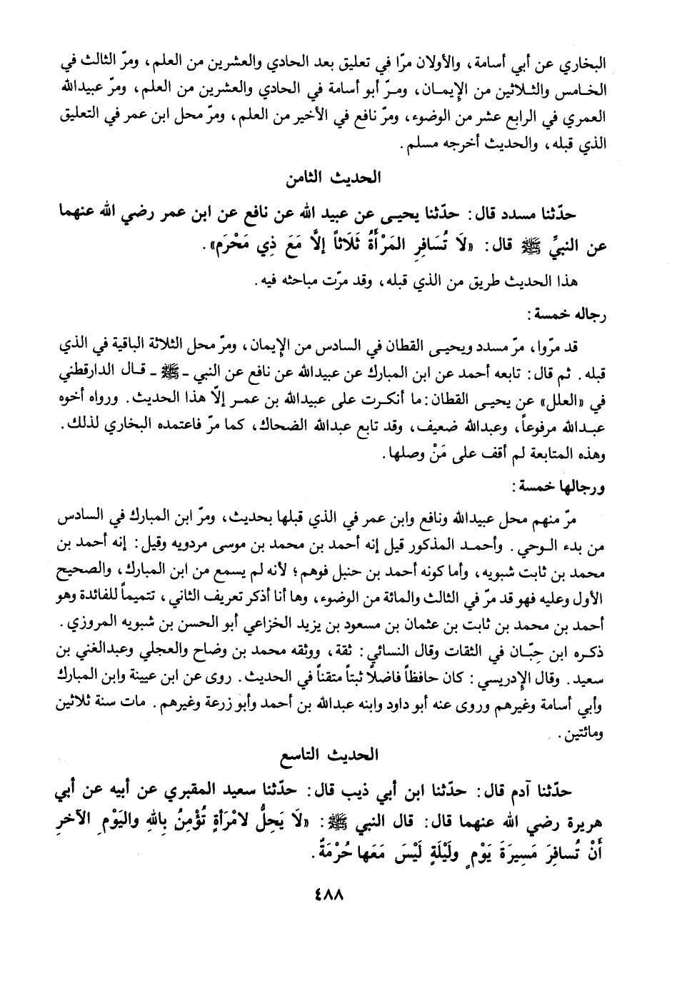 حَدَّثَنَا مُسَدَّدٌ قَالَ: حَدَّثَنَا يَحْيَى عَنْ عُبَيْدِ اللَّهِ عَنْ نَافِعٍ عَنِ ابْنِ عُمَرَ رضي الله عنهما عَنِ النَّبِيِّ -صلى الله عليه وسلم- قَالَ: "لاَ تُسَافِرِ الْمَرْأَةُ ثَلاَثًا إِلاَّ مَعَ ذِي مَحْرَمٍ".