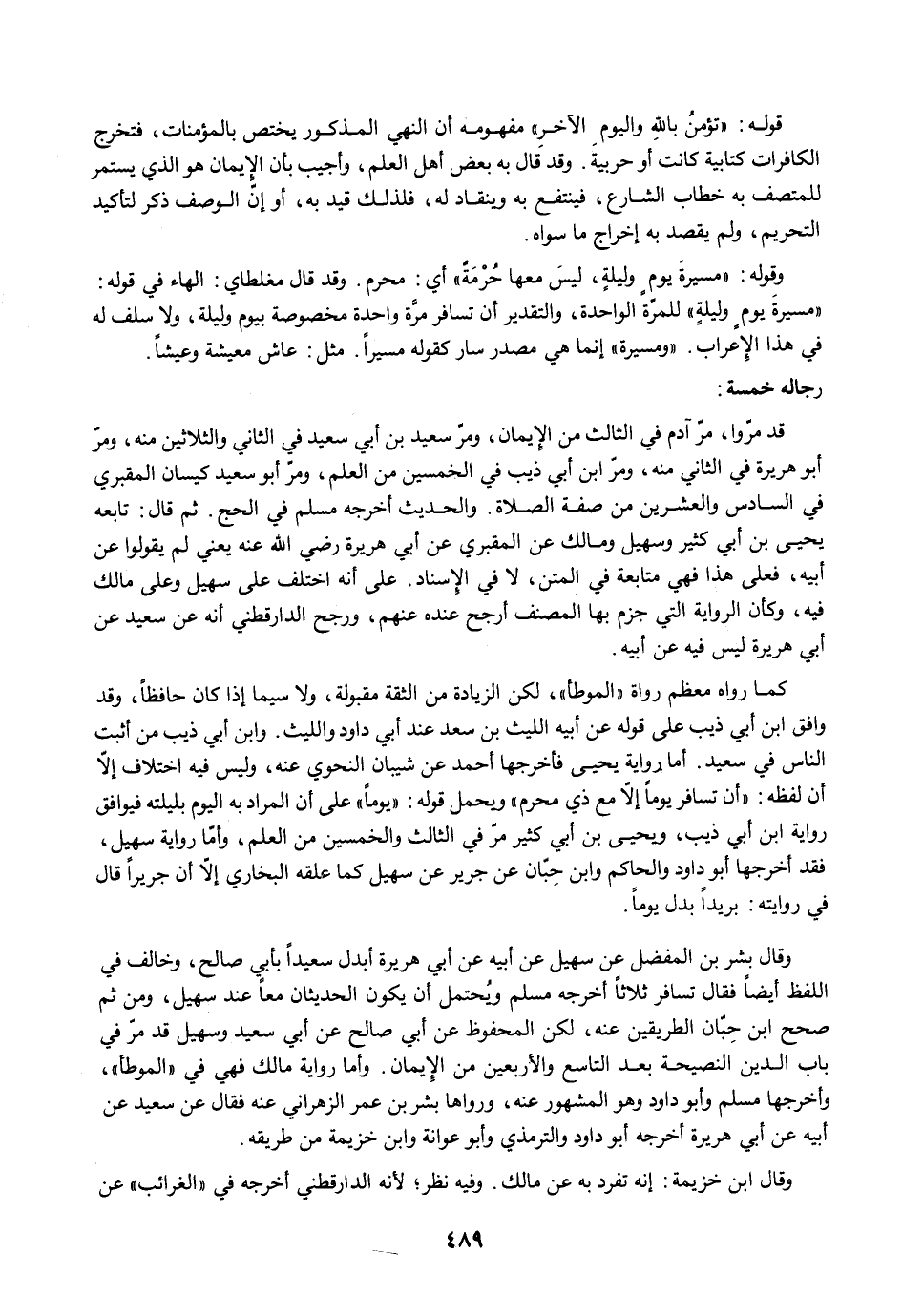 كما رواه معظم رواة "الموطأ"، لكن الزيادة من الثقة مقبولة، ولاسيما إذا كان حافظًا، وقد وافق ابن أبي ذيب على قوله عن أبيه الليث بن سعد عند أبي داود والليث. وابن أبي ذيب من أثبت الناس في سعيد. أما رواية يحيى فأخرجها أحمد عن شيبان النحوي عنه، وليس فيه اختلاف إلّا أن لفظه: "أن تسافر يومًا إلاَّ مع ذي محرم" ويحمل قوله: "يومًا" على أن المراد به اليوم بليلته فيوافق رواية ابن أبي ذيب، وحى بن أبي كثير مرَّ في الثالث والخمسين من العلم، وأمّا رواية سهيل، فقد أخرجها أبو داود والحاكم وابن حِبّان عن جرير عن سهيل كما علقه البخاري إلاَّ أن جريرًا قال في روايته: بريدًا بدل يومًا.
