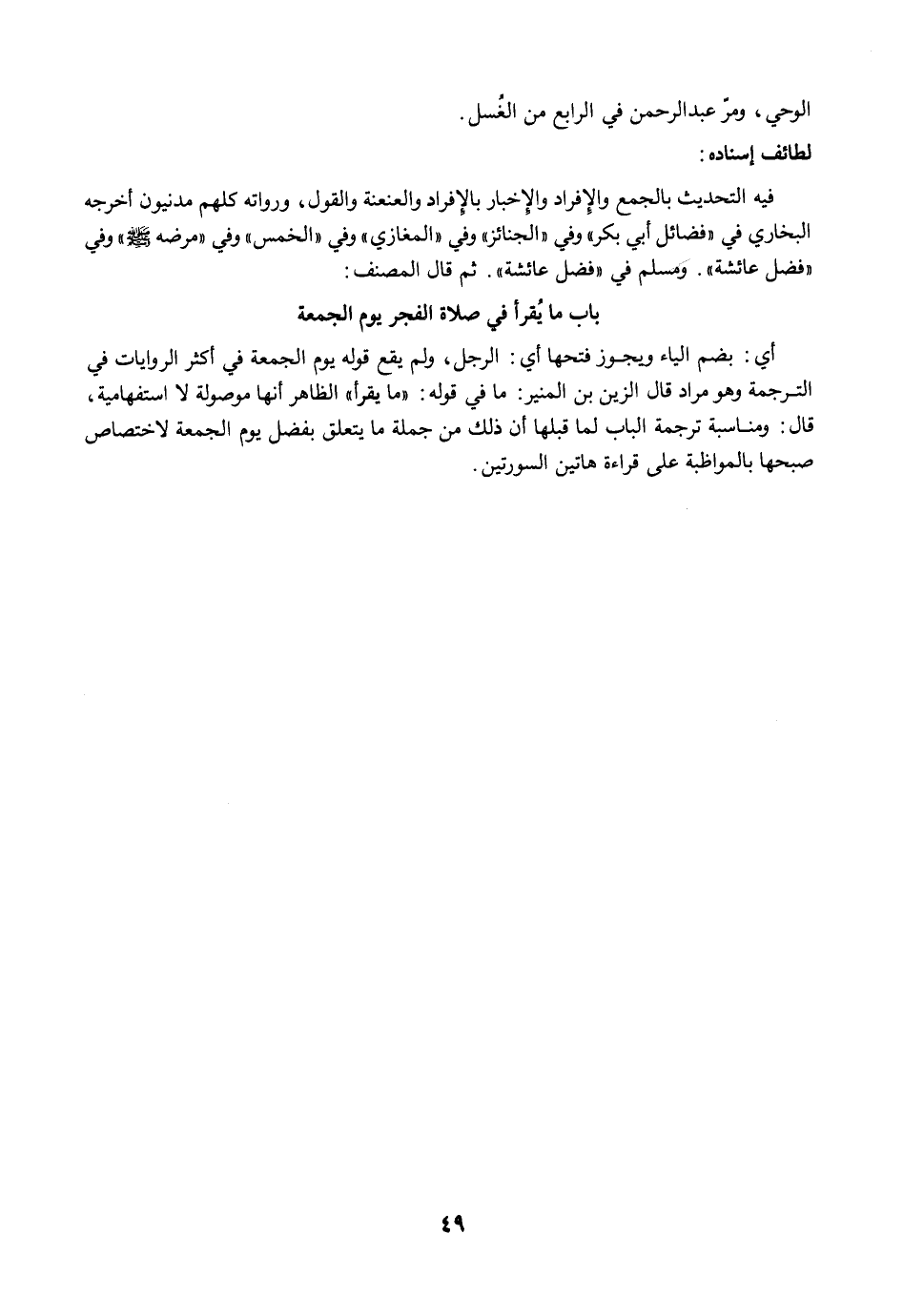 فيه التحديث بالجمع والإِفراد والإخبار بالإفراد والعنعنة والقول، ورواته كلهم مدنيون أخرجه البخاري في "فضائل أبي بكر" وفي "الجنائز" وفي "المغازي" وفي "الخمس" وفي "مرضه -صلى الله عليه وسلم-" وفي "فضل عائشة". ومسلم في "فضل عائشة". ثم قال المصنف: