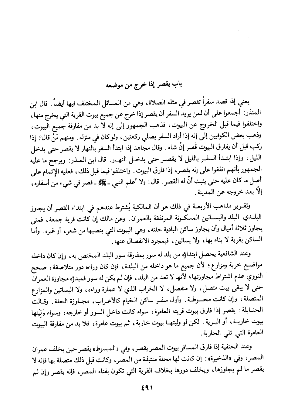 وعند الحنفية إذا فارق المسافر بيوت العصر يقصر، وفي "المبسوط" يقصر حين يخلف عمران العصر، وفي "الذخيرة": إن كانت لها محلة منتبذة من المصر، وكانت قبل ذلك متصلة بها فإنه لا يقصر ما لم يجاوزها، ويخلف دورها بخلاف القرية التي تكون بفناء المصر، فإنه يقصر وإن لم
