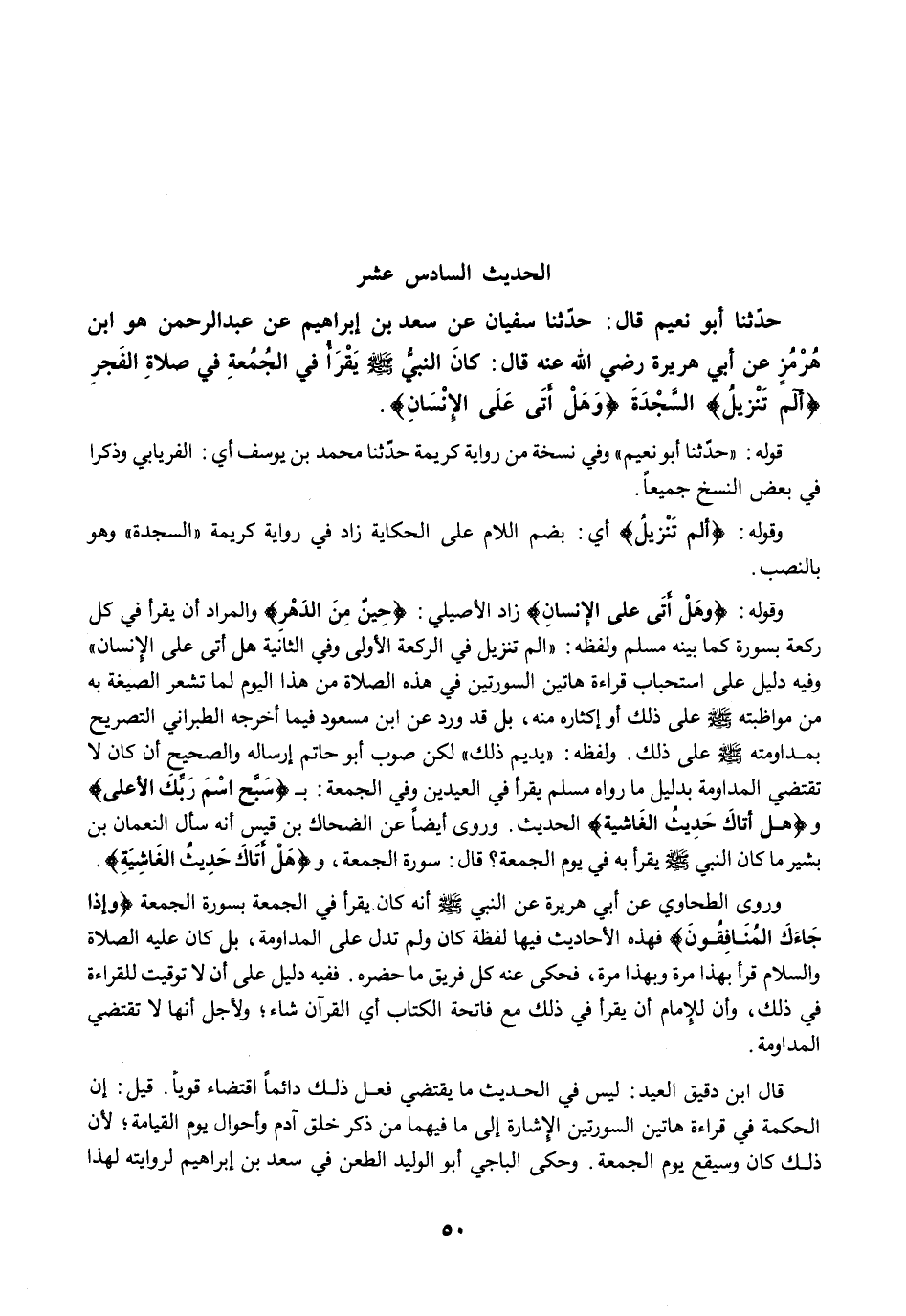 حَدَّثَنَا أَبُو نُعَيْمٍ قَالَ: حَدَّثَنَا سُفْيَانُ عَنْ سَعْدِ بْنِ إِبْرَاهِيمَ عَنْ عَبْدِ الرَّحْمَنِ هُوَ ابْنُ هُرْمُزَ عَنْ أَبِي هُرَيْرَةَ رضي الله عنه قَالَ: كَانَ النَّبِيُّ -صلى الله عليه وسلم- يَقْرَأُ فِي الْجُمُعَةِ فِي صَلاَةِ الْفَجْرِ {الم (1) تَنْزِيلُ} السَّجْدَةَ و {هَلْ أَتَى عَلَى الْإِنْسَانِ}.