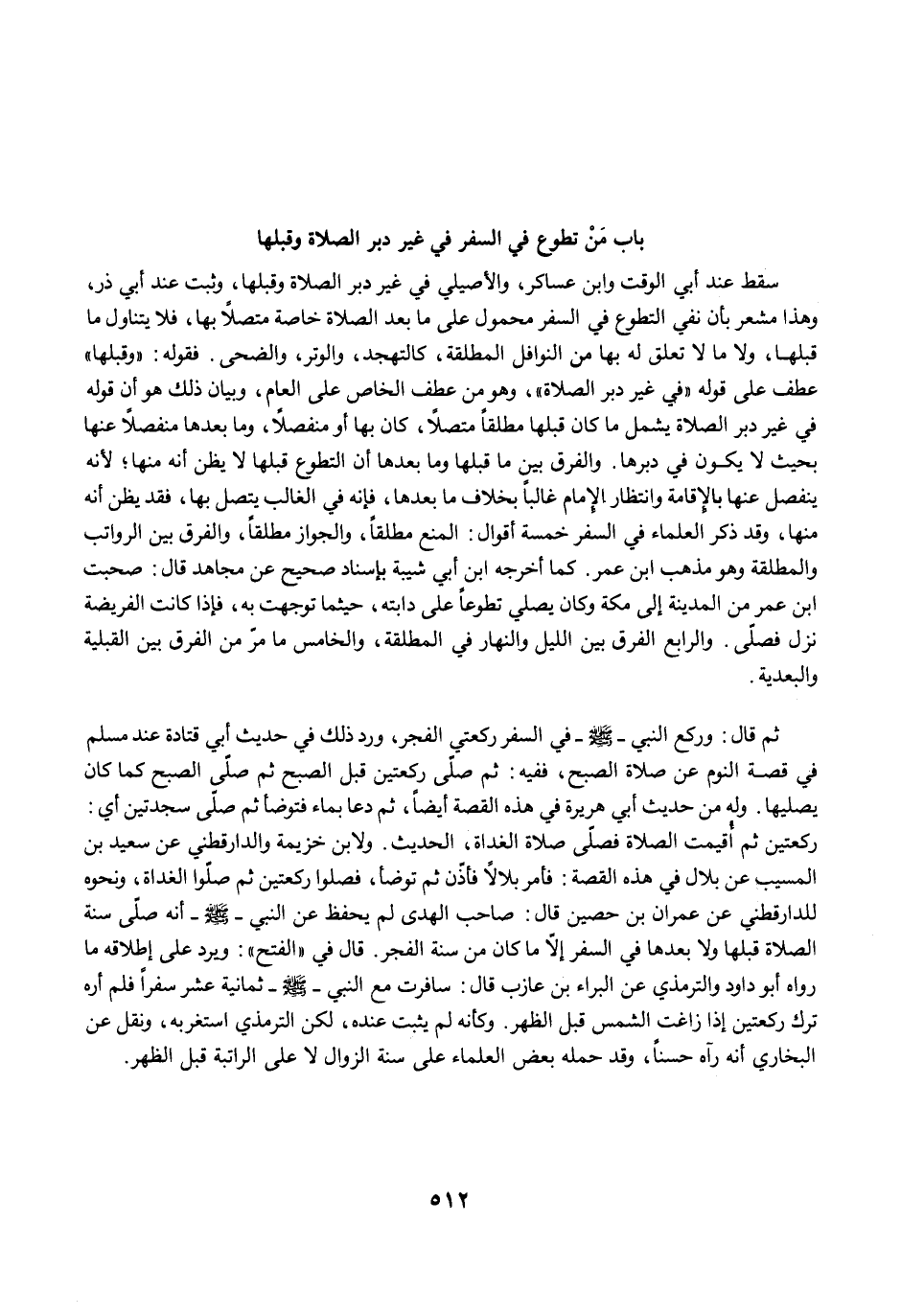 ثم قال: وركع النبي -صلى الله عليه وسلم- في السفر ركعتي الفجر، ورد ذلك في حديث أبي قتادة عند مسلم في قصة النوم عن صلاة الصبح، ففيه: ثم صلّى ركعتين قبل الصبح ثم صلّى الصبح كما كان يصليها. وله من حديث أبي هريرة في هذه القصة أيضًا، ثم دعا بماء فتوضأ ثم صلى سجدتين أي: ركعتين ثم أُقيمت الصلاة فصلّى صلاة الغداة، الحديث. ولابن خزيمة والدارقطني عن سعيد بن المسيب عن بلال في هذه القصة: فأمر بلالًا فأذّن ثم توضأ، فصلوا ركعتين ثم صلّوا الغداة، ونحوه للدارقطني عن عمران بن حصين قال: صاحب الهدى لم يحفظ عن النبي -صلى الله عليه وسلم- أنه صلّى سنة الصلاة قبلها ولا بعدها في السفر إلاَّ ما كان من سنة الفجر. قال في "الفتح": ويرد على إطلاقه ما رواه أبو داود والترمذي عن البراء بن عازب قال: سافرت مع النبي -صلى الله عليه وسلم- ثمانية عشر سفرًا فلم أره ترك ركعتين إذا زاغت الشمس قبل الظهر. وكأنه لم يثبت عنده، لكن الترمذي استغربه، ونقل عن البخاري أنه رآه حسنًا، وقد حمله بعض العلماء على سنة الزوال لا على الراتبة قبل الظهر.