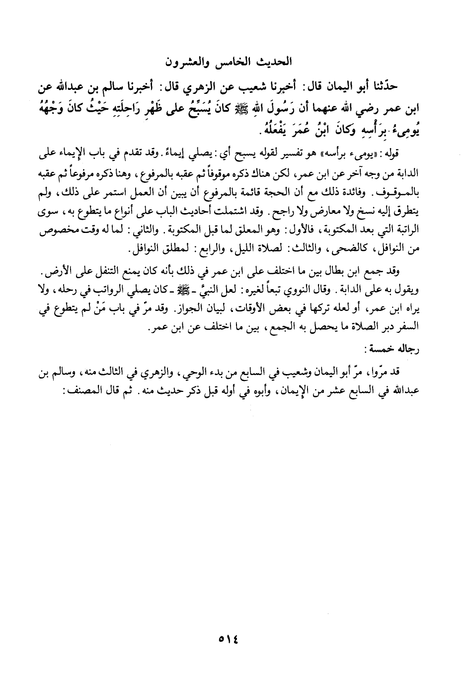 حَدَّثَنَا أَبُو الْيَمَانِ قَالَ: أَخْبَرَنَا شُعَيْبٌ عَنِ الزُّهْرِيِّ قَالَ: أَخْبَرَنِي سَالِمُ بْنُ عَبْدِ اللَّهِ عَنِ ابْنِ عُمَرَ رضي الله عنهما أَنَّ رَسُولَ اللَّهِ -صلى الله عليه وسلم- كَانَ يُسَبِّحُ عَلَى ظَهْرِ رَاحِلَتِهِ حَيْثُ كَانَ وَجْهُهُ، يُومِىءُ بِرَأْسِهِ، وَكَانَ ابْنُ عُمَرَ يَفْعَلُهُ.