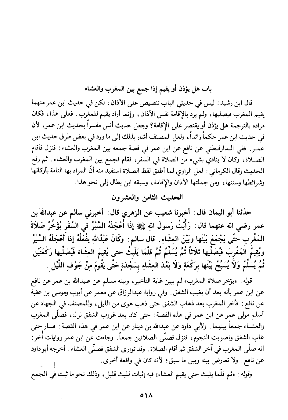 قال ابن رشيد: ليس في حديثي الباب تنصيص على الآذان، لكن في حديث ابن عمر منهما يقيم المغرب فيصليها، ولم يرد بالإقامة نفس الآذان، وإنما أراد يقيم للمغرب. فعلى هذا، فكان مراده بالترجمة هل يؤذن أو يقتصر على الإقامة؟ وجعل حديث أنس مفسرًا بحديث ابن عمر، لأن في حديث ابن عمر حكمًا زائدًا، ولعل المصنف أشار بذلك إلى ما ورد في بعض طرق حديث ابن عمر. ففي الدارقطني عن نافع عن ابن عمر في قصة جمعه بين المغرب والعشاء: فنزل فأقام الصلاة، وكان لا ينادي بشيء من الصلاة في السفر، فقام فجمع بين المغرب والعشاء. ثم رفع الحديث وقال الكرماني: لعل الراوي لما أطلق لفظ الصلاة استفيد منه أنّ المراد بها التامة بأركانها وشرائطها وسننها، ومن جملتها الآذان والإقامة، وسبقه ابن بطال إلى نحو هذا.