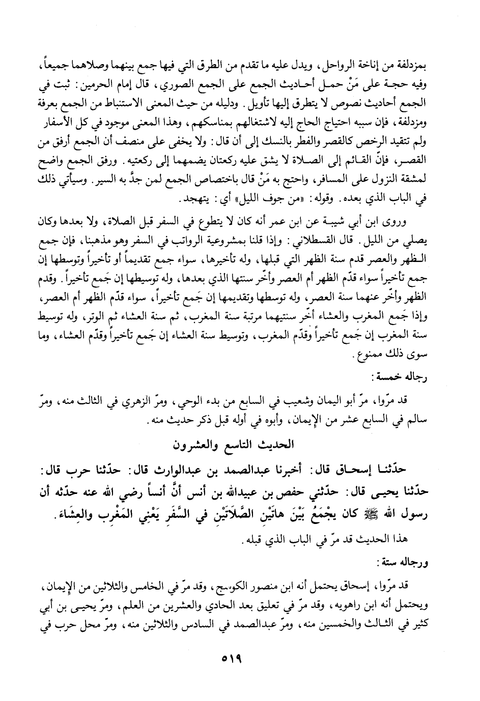 حَدَّثَنَا إِسْحَاقُ قَالَ: أخبرنا عَبْدُ الصَّمَدِ بن عبد الوارث قَالَ: حَدَّثَنَا حَرْبٌ قَالَ: حَدَّثَنَا يَحْيَى قَالَ: حَدَّثَنِى حَفْصُ بْنُ عُبَيْدِ اللَّهِ بْنِ أَنَسٍ أَنَّ أَنَسًا رضي الله عنه حَدَّثَهُ أَنَّ رَسُولَ اللَّهِ -صلى الله عليه وسلم- كَانَ يَجْمَعُ بَيْنَ هَاتَيْنِ الصَّلاَتَيْنِ فِي السَّفَرِ. يَعْنِي الْمَغْرِبَ وَالْعِشَاءَ.