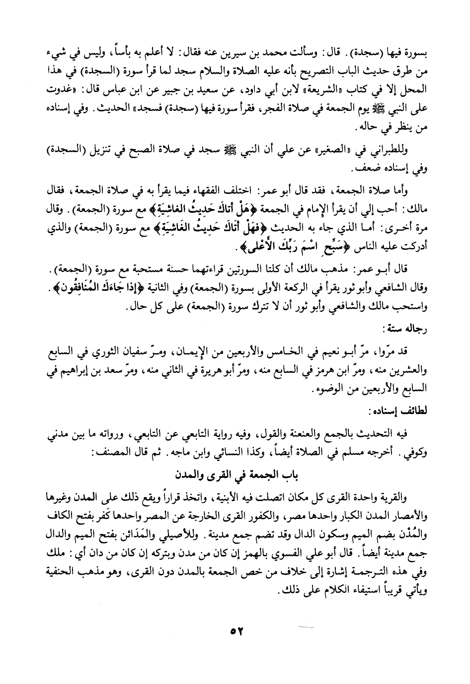 بسورة فيها (سجدة). قال: وسألت محمد بن سيرين عنه فقال: لا أعلم به بأسًا، وليس في شيء من طرق حديث الباب التصريح بأنه عليه الصلاة والسلام سجد لما قرأ سورة (السجدة) في هذا المحل إلا في كتاب "الشريعة" لابن أبي داود، عن سعيد بن جبير عن ابن عباس قال: "غدوت على النبي -صلى الله عليه وسلم- يوم الجمعة في صلاة الفجر، فقرأ سورة فيها (سجدة) فسجد" الحديث. وفي إسناده من ينظر في حاله.