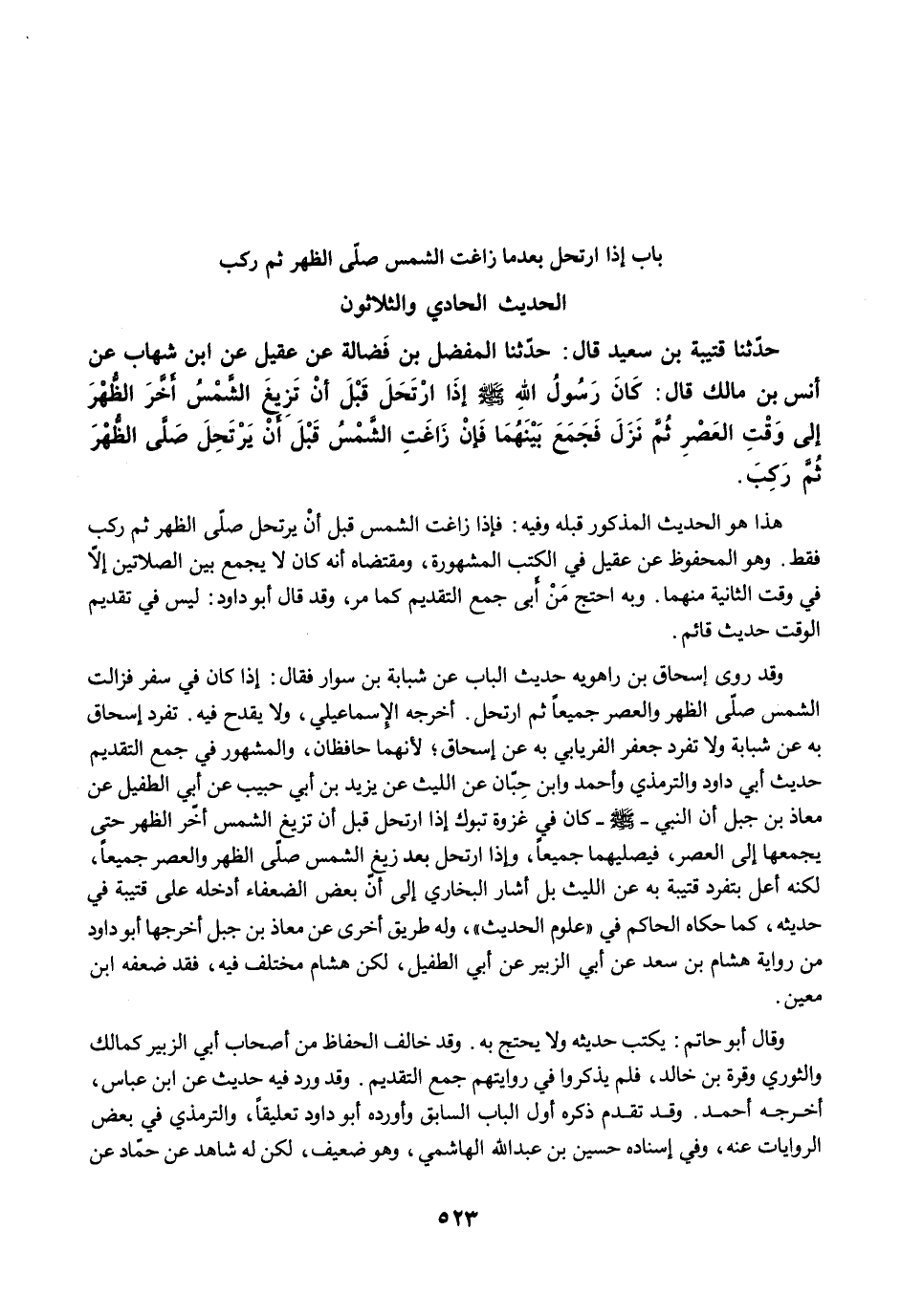حَدَّثَنَا قُتَيْبَةُ بن سعيد قَالَ: حَدَّثَنَا الْمُفَضَّلُ بْنُ فَضَالَةَ عَنْ عُقَيْلٍ عَنِ ابْنِ شِهَابٍ عَنْ أَنَسِ بْنِ مَالِكٍ قَالَ: كَانَ رَسُولُ اللَّهِ -صلى الله عليه وسلم- إِذَا ارْتَحَلَ قَبْلَ أَنْ تَزِيغَ الشَّمْسُ أَخَّرَ الظُّهْرَ إِلَى وَقْتِ الْعَصْرِ، ثُمَّ نَزَلَ فَجَمَعَ بَيْنَهُمَا، فَإِنْ زَاغَتِ الشَّمْسُ قَبْلَ أَنْ يَرْتَحِلَ صَلَّى الظُّهْرَ ثُمَّ رَكِبَ.