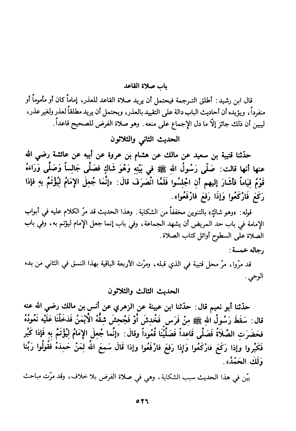 قال ابن رشيد: أطلق الترجمة فيحتمل أن يريد صلاة القاعد للعذر، إِمامًا كان أو مأمومًا أو منفردًا، ويؤيده أن أحاديث الباب دالة على التقييد بالعذر، ويحتمل أن يريد مطلقًا لعذر ولغير عذر، ليبين أن ذلك جائز إِلاَّ ما دل الإجماع على منعه. وهو صلاة الفرض للصحيح قاعدًا.