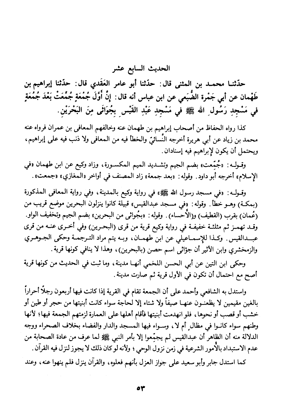 حَدَّثَنَا مُحَمَّدُ بْنُ الْمُثَنَّى قَالَ: حَدَّثَنَا أَبُو عَامِرٍ الْعَقَدِيُّ قَالَ: حَدَّثَنَا إِبْرَاهِيمُ بْنُ طَهْمَانَ عَنْ أَبِي جَمْرَةَ الضُّبَعِيِّ عَنِ ابْنِ عَبَّاسٍ أَنَّهُ قَالَ: إِنَّ أَوَّلَ جُمُعَةٍ جُمِّعَتْ بَعْدَ جُمُعَةٍ فِي مَسْجِدِ رَسُولِ اللَّهِ -صلى الله عليه وسلم- فِي مَسْجِدِ عَبْدِ الْقَيْسِ بِجُوَاثَى مِنَ الْبَحْرَيْنِ.