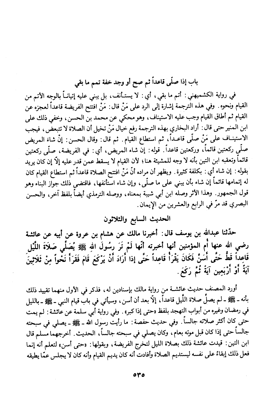 أورد المصنف حديث عائشة من رواية مالك بإسنادين له، فذكر في الأول منهما تقييد ذلك بأنه -صلى الله عليه وسلم- لم يصل صلاة اللَّيل قاعدًا، إلاَّ بعد أن أسن، وسيأتي في باب قيام النبي -صلى الله عليه وسلم- بالليل في رمضان وغيره من أبواب التهجد بلفظ "حتى إذا كبر". وفي رواية أبي سلمة عن عائشة: لم يمت حتى كان أكثر صلاته جالسًا. وفي حديث حفصة: ما رأيت رسول الله -صلى الله عليه وسلم- يصلي في سبحته جالسًا حتى إذا كان قبل موته بعام، وكان يصلي في سبحته جالسًا، الحديث. أخرجهما مسلم قال ابن التين: قيدت عائشة ذلك بصلاة الليل لتخرج الفريضة، وبقولها: "حتى أسن" لتعلم أنه إنما فعل ذلك إبقاءً على نفسه ليستديم الصلاة وأفادت أنه كان يديم القيام وأنه كان لا يجلس عمّا يطيقه