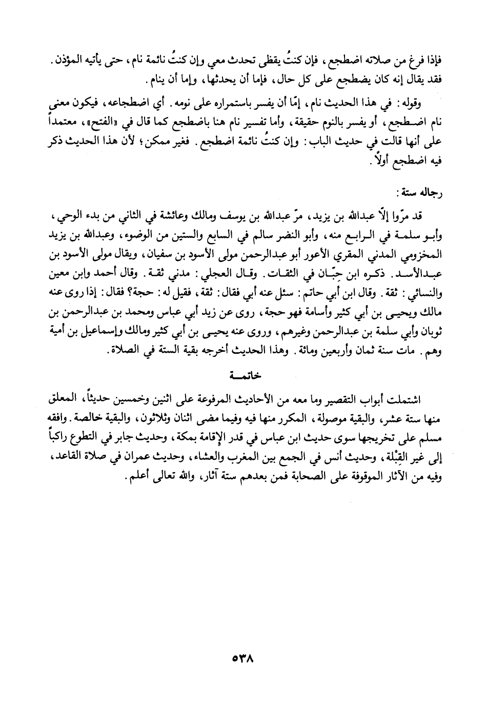 فإذا فرغ من صلاته اضطجع، فإن كنتُ يقظى تحدث معي وإن كنتُ نائمة نام، حتى يأتيه المؤذن. فقد يقال إنه كان يضطجع على كل حال، فإما أن يحدثها، وإما أن ينام.