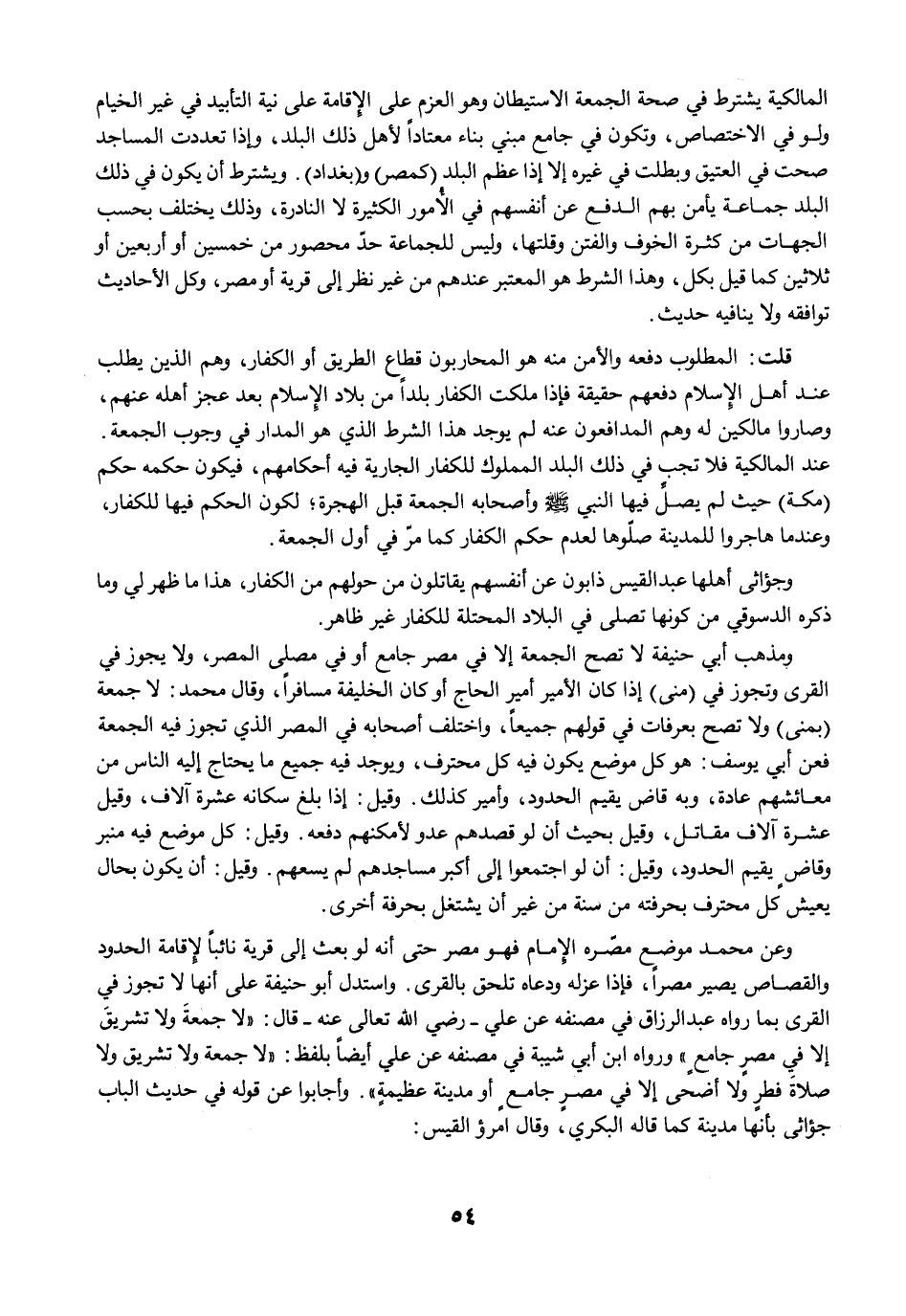 ومذهب أبي حنيفة لا تصح الجمعة إلا في مصر جامع أو في مصلى العصر، ولا يجوز في القرى وتجوز في (مني) إذا كان الأمير أمير الحاج أو كان الخليفة مسافرًا، وقال محمد: لا جمعة (بمنى) ولا تصح بعرفات في قولهم جميعًا، واختلف أصحابه في العصر الذي تجوز فيه الجمعة فعن أبي يوسف: هو كل موضع يكون فيه كل محترف، ويوجد فيه جميع ما يحتاج إليه الناس من معائشهم عادة، وبه قاض يقيم الحدود، وأمير كذلك. وقيل: إذا بلغ سكانه عشرة آلاف، وقيل عشرة آلاف مقاتل، وقيل بحيث أن لو قصدهم عدو لأمكنهم دفعه. وقيل: كل موضع فيه منبر وقاضٍ يقيم الحدود، وقيل: أن لو اجتمعوا إلى أكبر مساجدهم لم يسعهم. وقيل: أن يكون بحال يعيش كل محترف بحرفته من سنة من غير أن يشتغل بحرفة أخرى.
