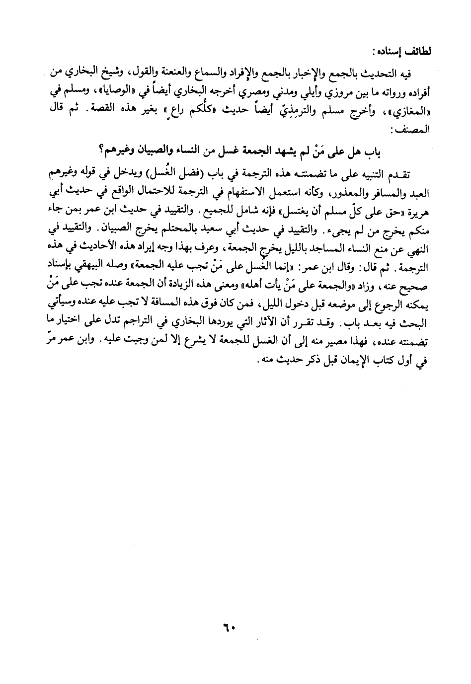 تقدم التنبيه على ما تضمنته هذه الترجمة في باب (فضل الغُسل) ويدخل في قوله وغيرهم العبد والمسافر والمعذور، وكأنه استعمل الاستفهام في الترجمة للاحتمال الواقع في حديث أبي هريرة "حق على كلّ مسلم أن يغتسل" فإنه شامل للجميع. والتقييد في حديث ابن عمر بمن جاء منكم يخرج من لم يجىء. والتقييد في حديث أبي سعيد بالمحتلم يخرج الصبيان. والتقييد في النهي عن منع النساء المساجد بالليل يخرج الجمعة، وعرف بهذا وجه إيراد هذه الأحاديث في هذه الترجمة. ثم قال: وقال ابن عمر: "انما الغُسل على مَنْ تجب عليه الجمعة" وصله البيهقي بإسناد صحيح عنه، وزاد "والجمعة على مَنْ يأت أهله" ومعنى هذه الزيادة أن الجمعة عنده تجب على مَنْ يمكنه الرجوع إلى موضعه قبل دخول الليل، فمن كان فوق هذه المسافة لا تجب عليه عنده وسيأتي البحث فيه بعد باب. وقد تقرر أن الآثار التي يوردها البخاري في التراجم تدل على اختيار ما تضمنته عنده، فهذا مصير منه إلى أن الغسل للجمعة لا يشرع إلا لمن وجبت عليه. وابن عمر مرّ في أول كتاب الإيمان قبل ذكر حديث منه.