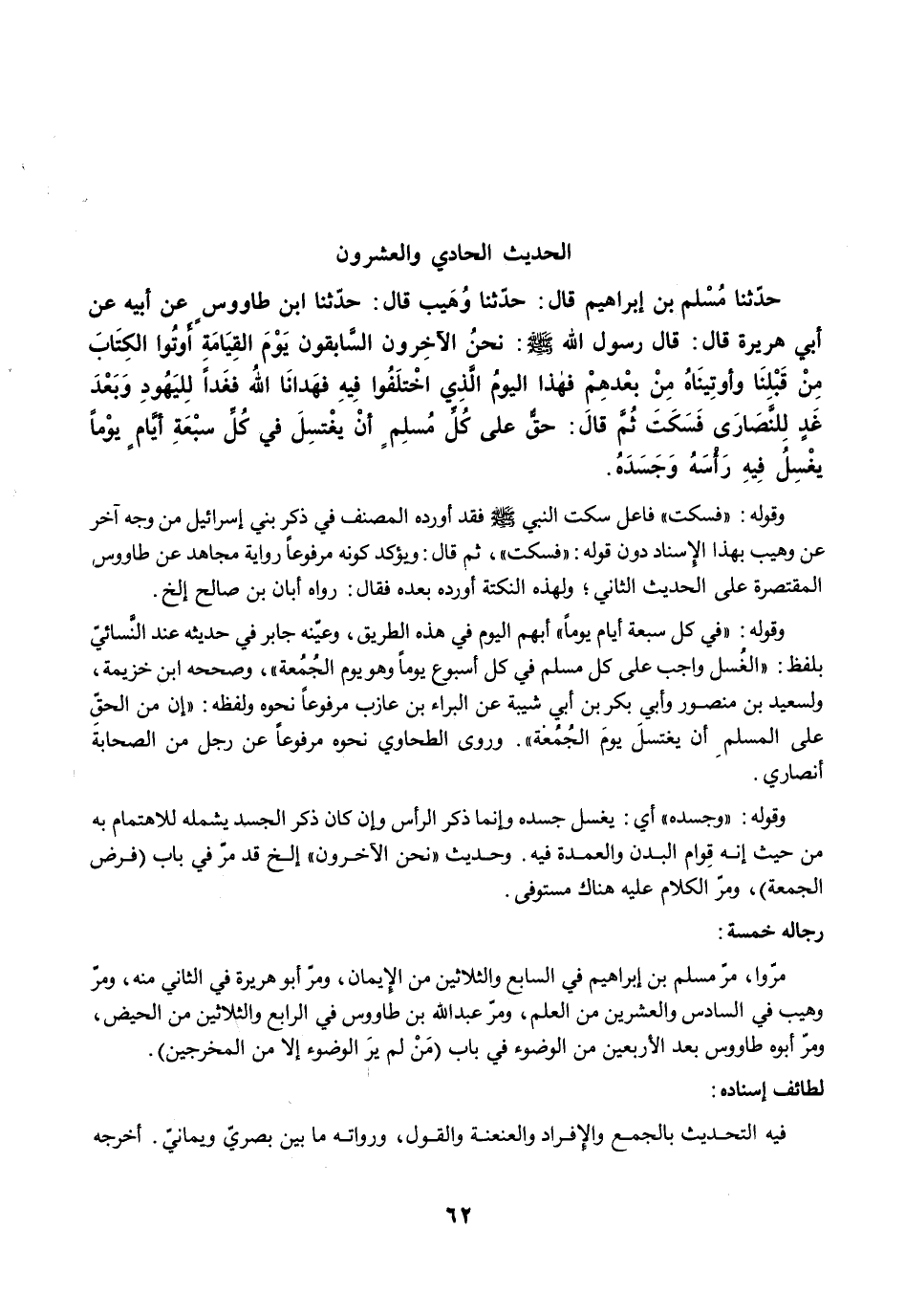 حَدَّثَنَا مُسْلِمُ بْنُ إِبْرَاهِيمَ قَالَ: حَدَّثَنَا وُهَيْبٌ قَالَ: حَدَّثَنَا ابْنُ طَاوُسٍ عَنْ أَبِيهِ عَنْ أَبِي هُرَيْرَةَ قَالَ: قَالَ رَسُولُ اللَّهِ -صلى الله عليه وسلم-: نَحْنُ الآخِرُونَ السَّابِقُونَ يَوْمَ الْقِيَامَةِ، أُوتُوا الْكِتَابَ مِنْ قَبْلِنَا، وَأُوتِينَاهُ مِنْ بَعْدِهِمْ، فَهَذَا الْيَوْمُ الَّذِى اخْتَلَفُوا فِيهِ فَهَدَانَا اللَّهُ، فَغَدًا لِلْيَهُودِ وَبَعْدَ غَدٍ لِلنَّصَارَى. فسكت ثُمَّ قَالَ: حَقٌّ عَلَى كُلِّ مُسْلِمٍ أَنْ يَغْتَسِلَ فِي كُلِّ سَبْعَةِ أَيَّامٍ يَوْمًا يَغْسِلُ فِيهِ رَأْسَهُ وَجَسَدَهُ.