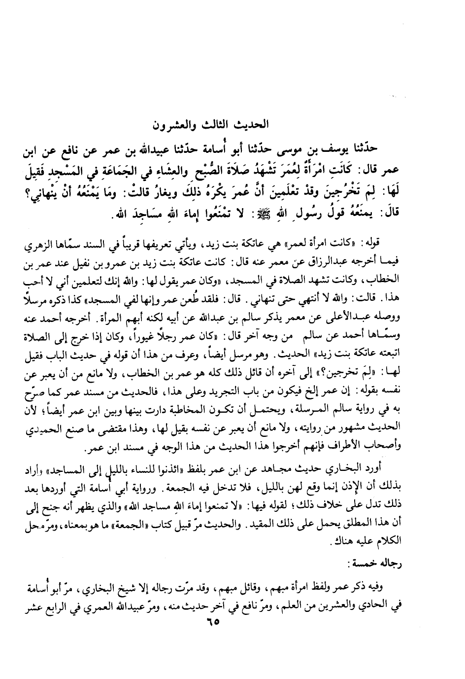 حَدَّثَنَا يُوسُفُ بْنُ مُوسَى حَدَّثَنَا أَبُو أُسَامَةَ حَدَّثَنَا عُبَيْدُ اللَّهِ بْنُ عُمَرَ عَنْ نَافِعٍ عَنِ ابْنِ عُمَرَ قَالَ: كَانَتِ امْرَأَةٌ لِعُمَرَ تَشْهَدُ صَلاَةَ الصُّبْحِ وَالْعِشَاءِ فِي الْجَمَاعَةِ فِي الْمَسْجِدِ، فَقِيلَ لَهَا: لِمَ تَخْرُجِينَ وَقَدْ تَعْلَمِينَ أَنَّ عُمَرَ يَكْرَهُ ذَلِكَ وَيَغَارُ قَالَتْ: وَمَا يَمْنَعُهُ أَنْ يَنْهَانِي؟ قَالَ: يَمْنَعُهُ قَوْلُ رَسُولِ اللَّهِ -صلى الله عليه وسلم-: لاَ تَمْنَعُوا إِمَاءَ اللَّهِ مَسَاجِدَ اللَّهِ.
