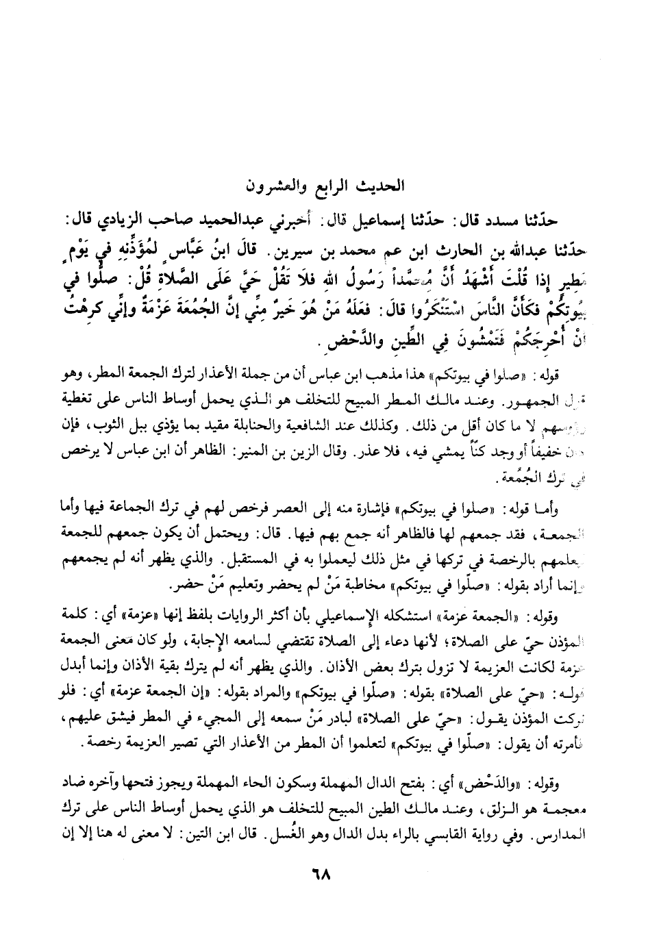 حَدَّثَنَا مُسَدَّدٌ قَالَ: حَدَّثَنَا إِسْمَاعِيلُ قَالَ: أَخْبَرَنِي عَبْدُ الْحَمِيدِ صَاحِبُ الزِّيَادِيِّ قَالَ: حَدَّثَنَا عَبْدُ اللَّهِ بْنُ الْحَارِثِ ابْنُ عَمِّ مُحَمَّدِ بْنِ سِيرِينَ قَالَ ابْنُ عَبَّاسٍ لِمُؤَذِّنِهِ فِي يَوْمٍ مَطِيرٍ إِذَا قُلْتَ أَشْهَدُ أَنَّ مُحَمَّدًا رَسُولُ اللَّهِ. فَلاَ تَقُلْ حَيَّ عَلَى الصَّلاَةِ. قُلْ صَلُّوا فِي بُيُوتِكُمْ. فَكَأَنَّ النَّاسَ اسْتَنْكَرُوا، قَالَ: فَعَلَهُ مَنْ هُوَ خَيْرٌ مِنِّي، إِنَّ الْجُمُعَةَ عَزْمَةٌ، وَإِنِّيكَرِهْتُ أَنْ أُخْرِجَكُمْ، فَتَمْشُونَ فِي الطِّينِ وَالدَّحْضِ.