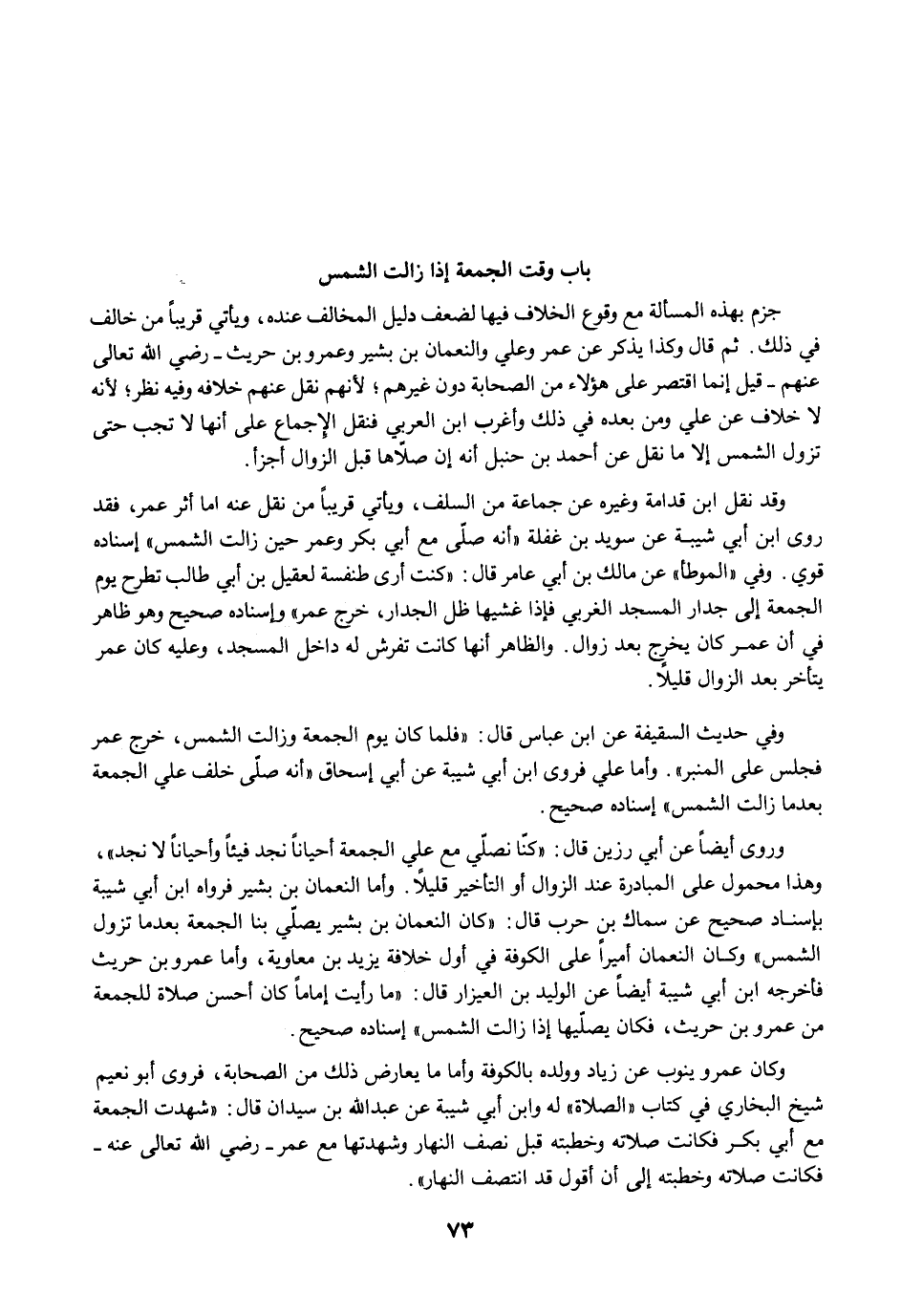 وروى أيضًا عن أبي رزين قال: "كنا نصلّي مع علي الجمعة أحيانًا نجد فيئًا وأحيانًا لا نجد"، وهذا محمول على المبادرة عند الزوال أو التأخير قليلًا. وأما النعمان بن بشير فرواه ابن أبي شيبة بإسناد صحيح عن سماك بن حرب قال: "كان النعمان بن بشير يصلّي بنا الجمعة بعدما تزول الشمس" وكان النعمان أميرًا على الكوفة في أول خلافة يزيد بن معاوية، وأما عمرو بن حريث فأخرجه ابن أبي شيبة أيضًا عن الوليد بن العيزار قال: "ما رأيت إمامًا كان أحسن صلاة للجمعة من عمرو بن حريث، فكان يصلّيها إذا زالت الشمس" إسناده صحيح.
