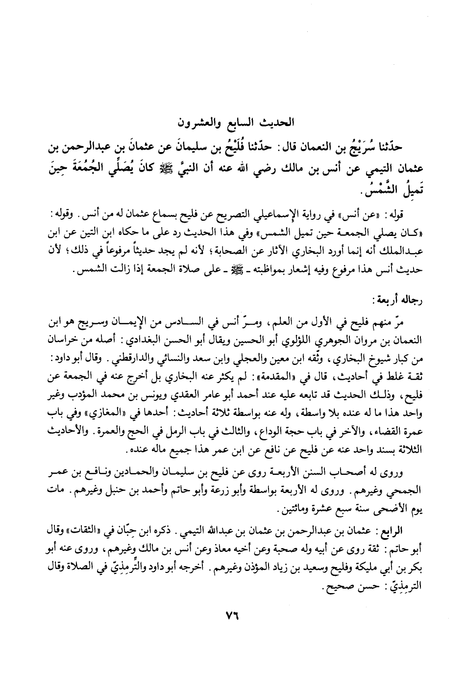 مرّ منهم فليح في الأول من العلم، ومرّ أنس في السادس من الإِيمان وسريج هو ابن النعمان بن مروان الجوهري اللؤلوي أبو الحسين ويقال أبو الحسن البغدادي: أصله من خراسان من كبار شيوخ البخاري، وثقه ابن معين والعجلي وابن سعد والنسائي والدارقطني. وقال أبو داود: ثقة غلط في أحاديث، قال في "المقدمة": لم يكثر عنه البخاري بل أخرج عنه في الجمعة عن فليح، وذلك الحديث قد تابعه عليه عند أحمد أبو عامر العقدي ويونس بن محمد المؤدب وغير واحد هذا ما له عنده بلا واسطة، وله عنه بواسطة ثلاثة أحاديث: أحدها في "المغازي" وفي باب عمرة القضاء، والآخر في باب حجة الوداع، والثالث في باب الرمل في الحج والعمرة. والأحاديث الثلاثة بسند واحد عنه عن فليح عن نافع عن ابن عمر هذا جميع ماله عنده.