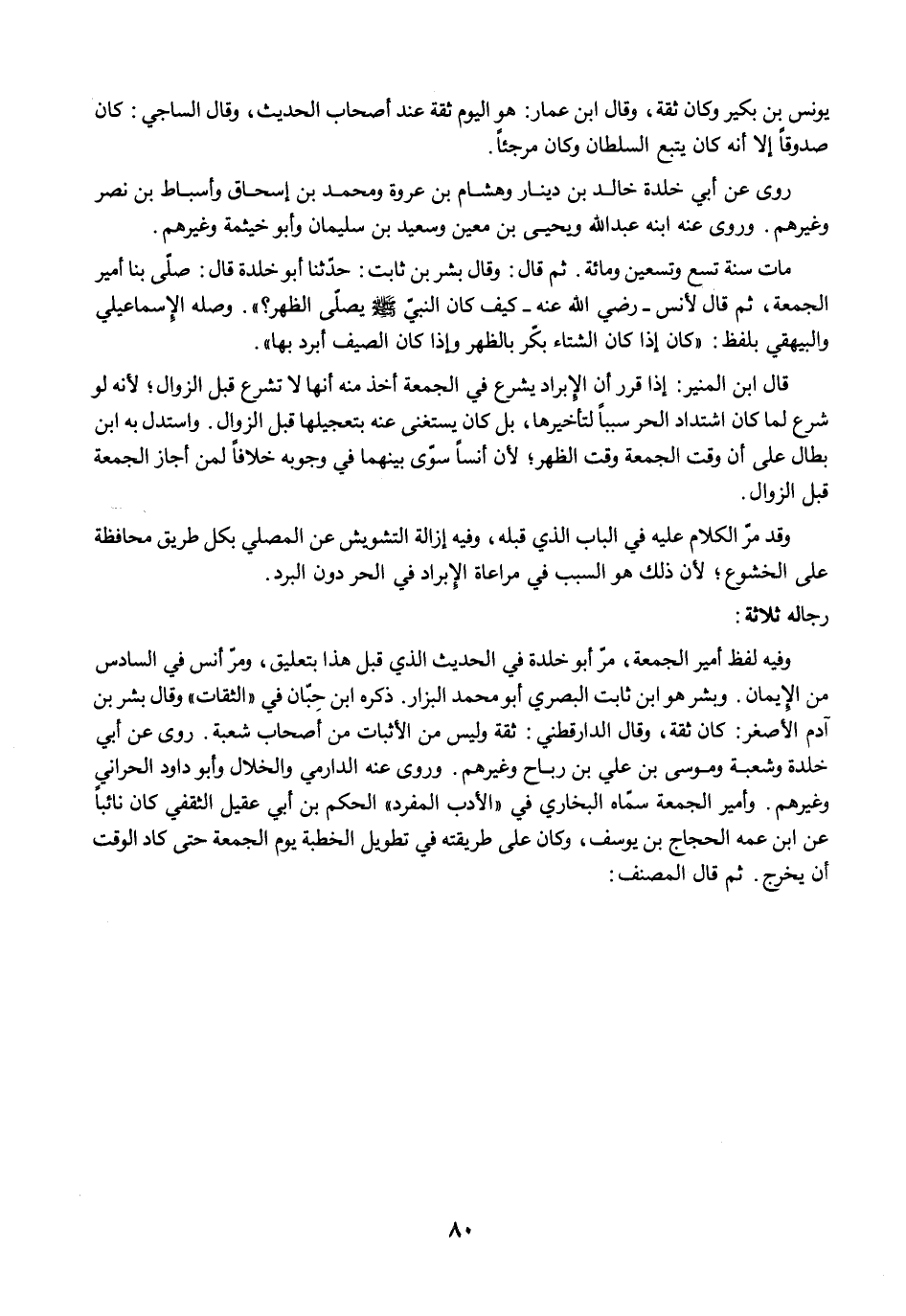 مات سنة تسع وتسعين ومائة. ثم قال: وقال بشر بن ثابت: حدّثنا أبو خلدة قال: صلّى بنا أمير الجمعة، ثم قال لأنس -رضي الله عنه- كيف كان النبيّ -صلى الله عليه وسلم- يصلّي الظهر؟ ". وصله الإِسماعيلي والبيهقي بلفظ: "كان إذا كان الشتاء بكّر بالظهر وإذا كان الصيف أبرد بها".