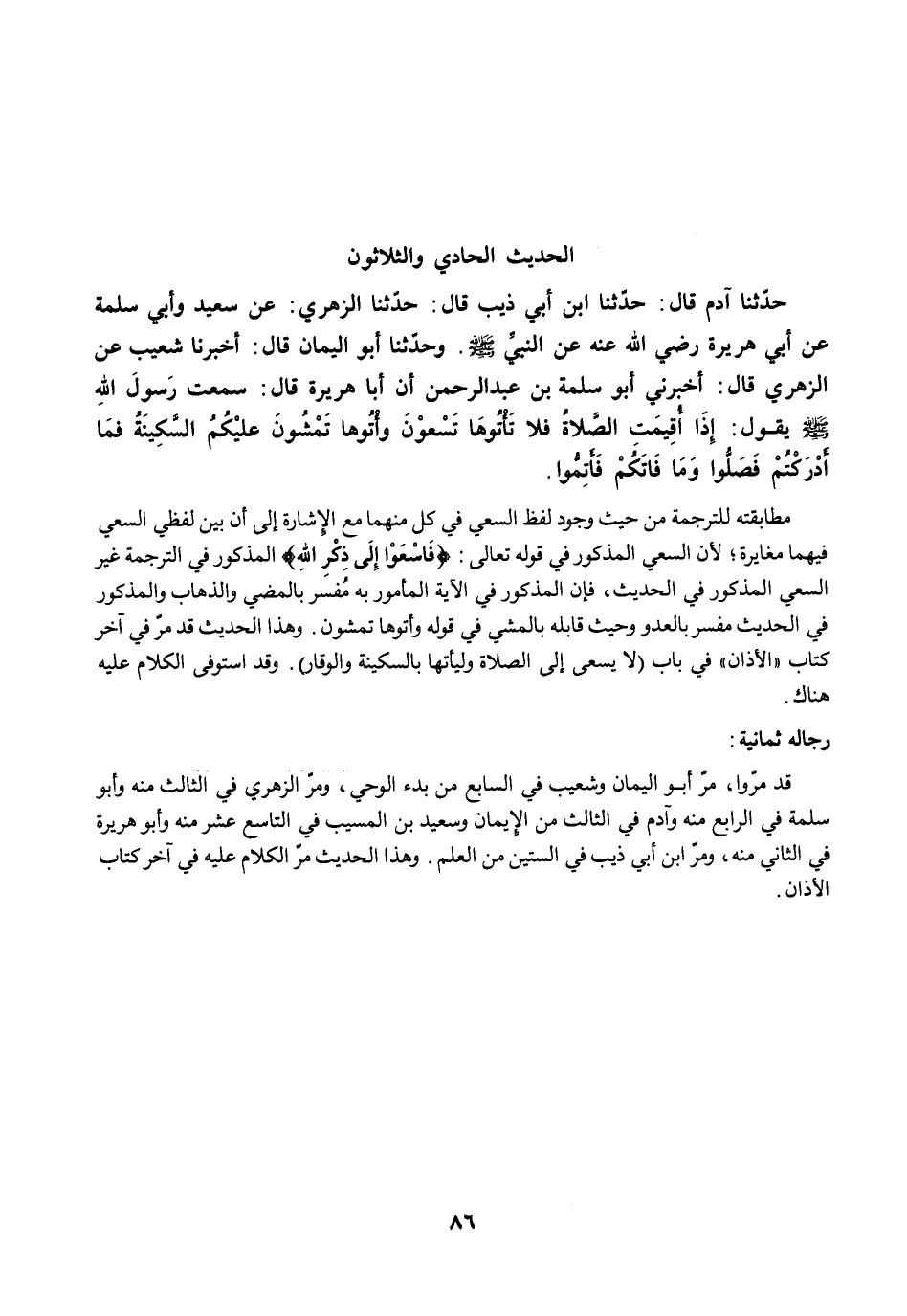 حَدَّثَنَا آدَمُ قَالَ: حَدَّثَنَا ابْنُ أَبِي ذِئْبٍ قَالَ: الزُّهْرِيُّ: عَنْ سَعِيدٍ وَأَبِي سَلَمَةَ عَنْ أَبِي هُرَيْرَةَ رضي الله عنه عَنِ النَّبِيِّ -صلى الله عليه وسلم-. وَحَدَّثَنَا أَبُو الْيَمَانِ قَالَ: أَخْبَرَنَا شُعَيْبٌ عَنِ الزُّهْرِيِّ قَالَ: أَخْبَرَنِي أَبُو سَلَمَةَ بْنُ عَبْدِ الرَّحْمَنِ أَنَّ أَبَا هُرَيْرَةَ قَالَ: سَمِعْتُ رَسُولَ اللَّهِ -صلى الله عليه وسلم- يَقُولُ: إِذَا أُقِيمَتِ الصَّلاَةُ فَلاَ تَأْتُوهَا تَسْعَوْنَ، وَأْتُوهَا تَمْشُونَ عَلَيْكُمُ السَّكِينَةُ، فَمَا أَدْرَكْتُمْ فَصَلُّوا، وَمَا فَاتَكُمْ فَأَتِمُّوا.