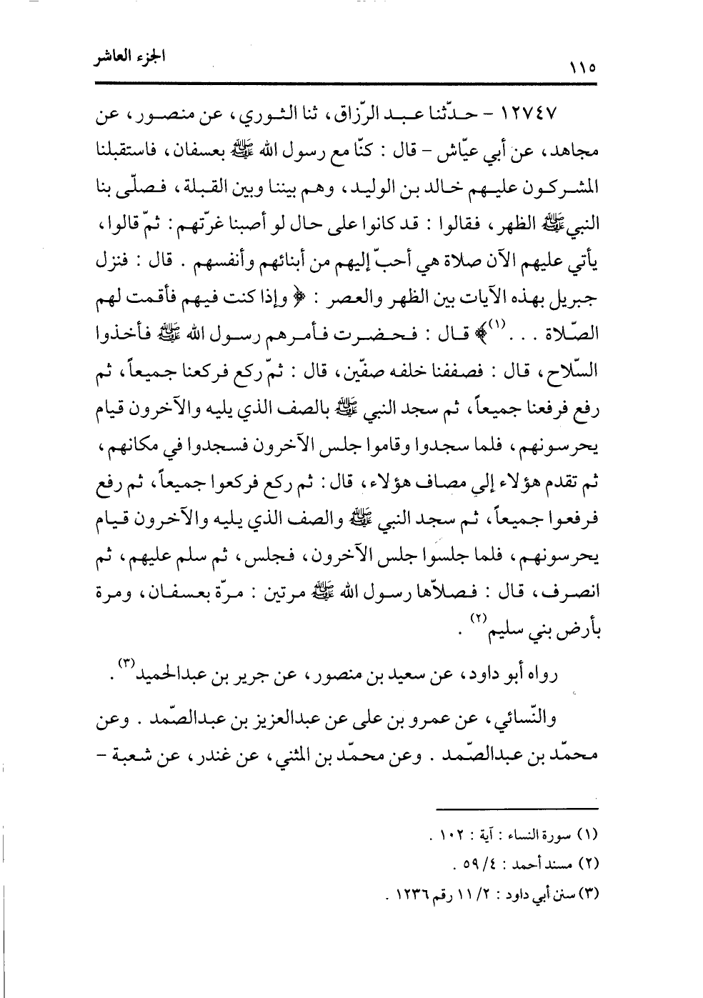 12747 - حدثنا عبد الرزاق، ثنا الثوري، عن منصور، عن مجاهد، عن أبي عياش -قال: كنا مع رسول الله - صلى الله عليه وسلم - بعسفان، فاستقبلنا المشركون عليهم خالد بن الوليد، وهم بيننا وبين القبلة، فصلى بنا النبي - صلى الله عليه وسلم - الظهر، فقالوا: قد كانوا على حال لو أصبنا غرتهم: ثم قالوا، يأتي عليهم الآن صلاة هي أحب إليهم من أبنائهم وأنفسهم. قال: فنزل جبريل بهذه الآيات بين الظهر والعصر: {وَإِذَا كُنْتَ فِيهِمْ فَأَقَمْتَ لَهُمُ الصَّلاة ... َ} (¬1) ، قال: فحضرت فأمرهم رسول الله - صلى الله عليه وسلم - فأخذوا السلاح، قال: فصففنا خلفه صفين، قال: ثم ركع فركعنا جميعاً، ثم رفع فرفعنا جميعاً، ثم سجد النبي - صلى الله عليه وسلم - بالصف الذي يليه والآخرون قيام يحرسونهم، فلما سجدوا وقاموا جلس الآخرون فسجدوا في مكانهم، ثم تقدم هؤلاء إلى مصاف هؤلاء، قال: ثم ركع فركعوا جميعاً، ثم رفع فرفعوا جميعاً، ثم سجد النبي - صلى الله عليه وسلم - والصف الذي يليه والآخرون قيام يحرسونهم، فلما جلسوا جلس الآخرون، فجلس، ثم سلم عليهم، ثم انصرف، قال: فصلاها رسول الله - صلى الله عليه وسلم - مرتين: مرة بعسفان، ومرة بأرض بني سليم (¬2) .
