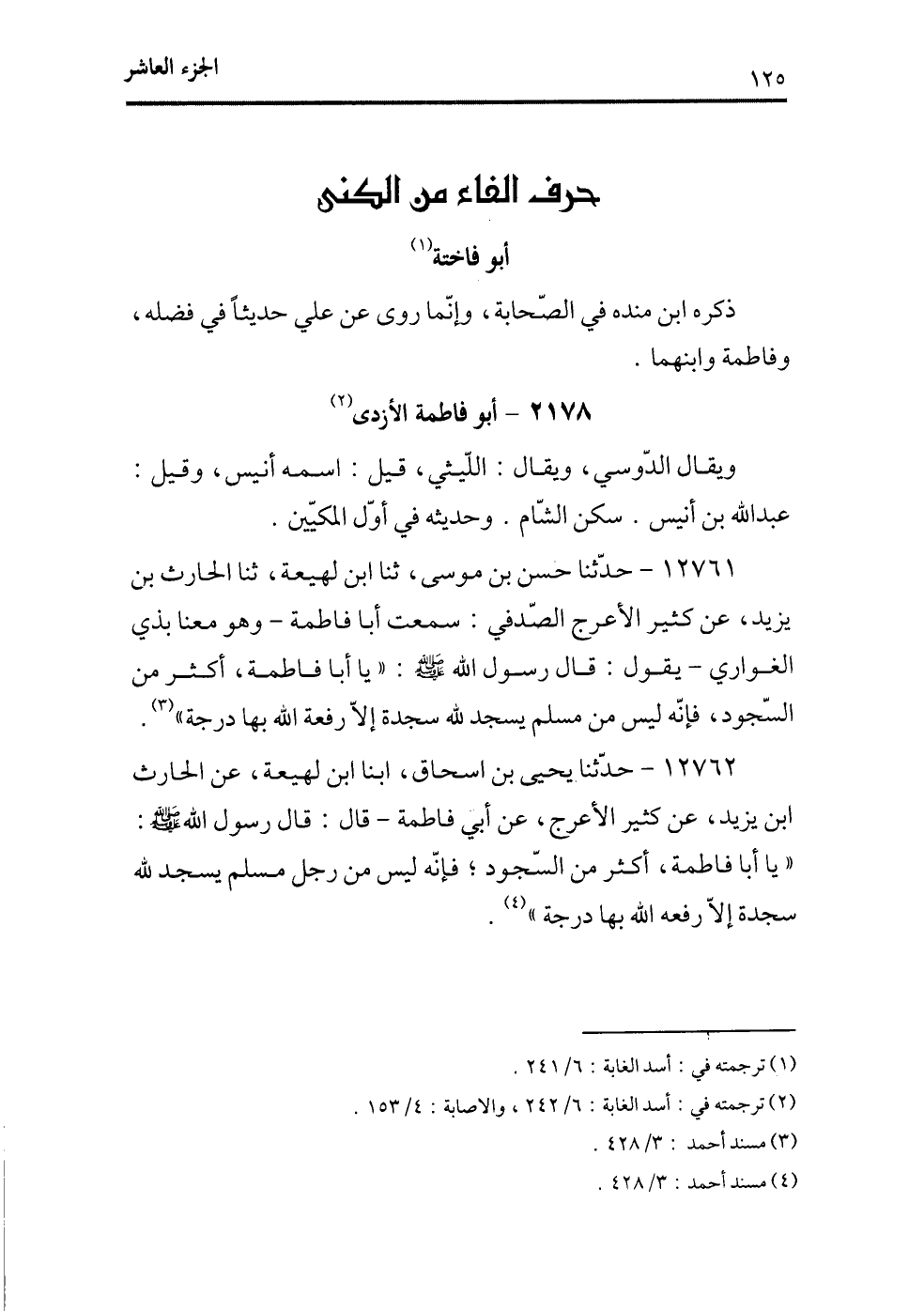 12761 - حدثنا حسن بن موسى، ثنا ابن لهيعة، ثنا الحارث بن يزيد، عن كثير الأعرج الصدفي: سمعت أبا فاطمة - وهو معنا بذي الغواري - يقول: قال رسول الله - صلى الله عليه وسلم -: ((يا أبا فاطمة، أكثر من السجود، فإنه ليس من مسلم يسجد لله سجدة إلا رفعه الله بها درجة)) (¬2) .