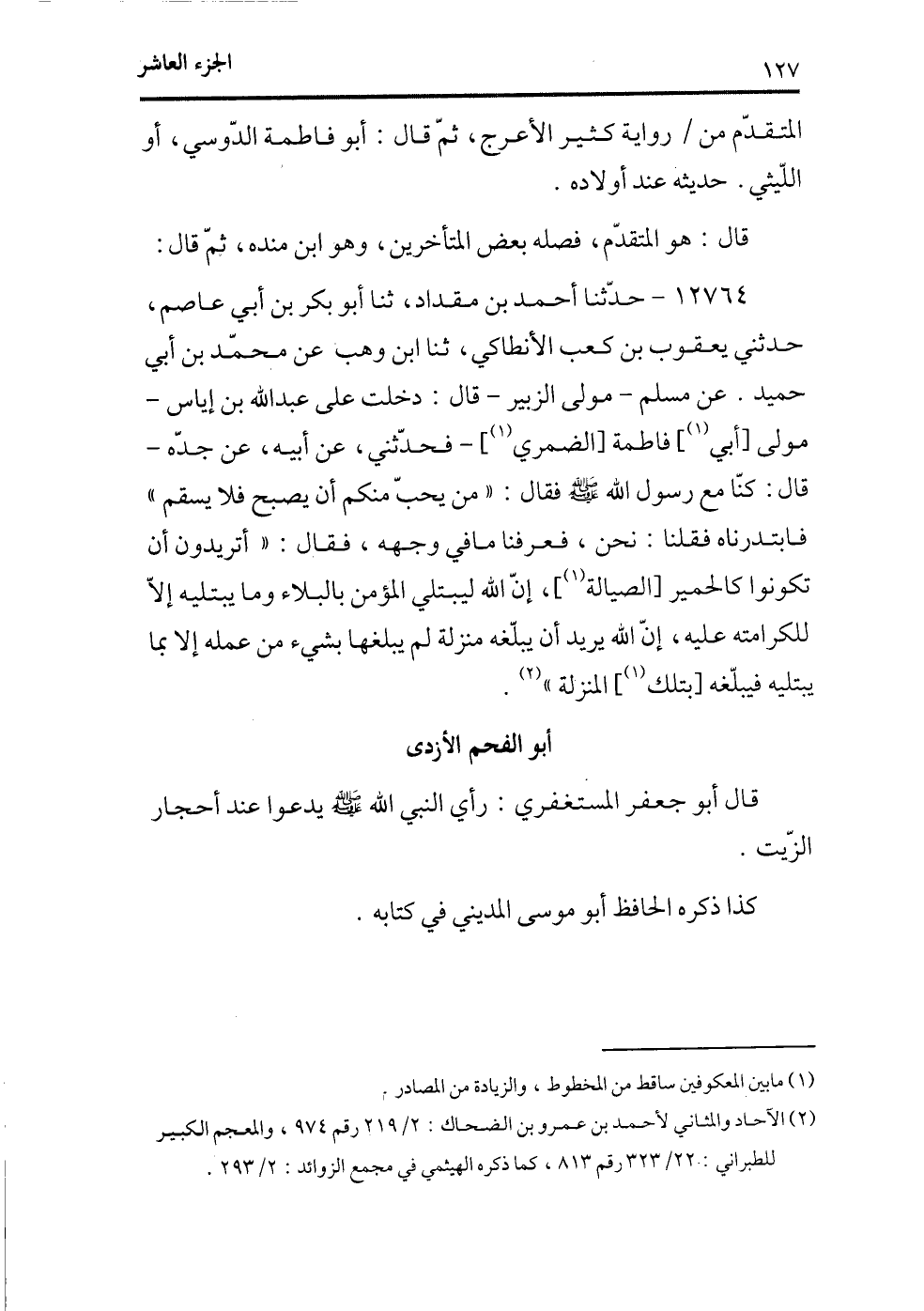 المتقدم من / رواية كثير الأعرج، ثم قال: أبو فاطمة الدوسي، أو الليثي. حديثه عند أولاده.