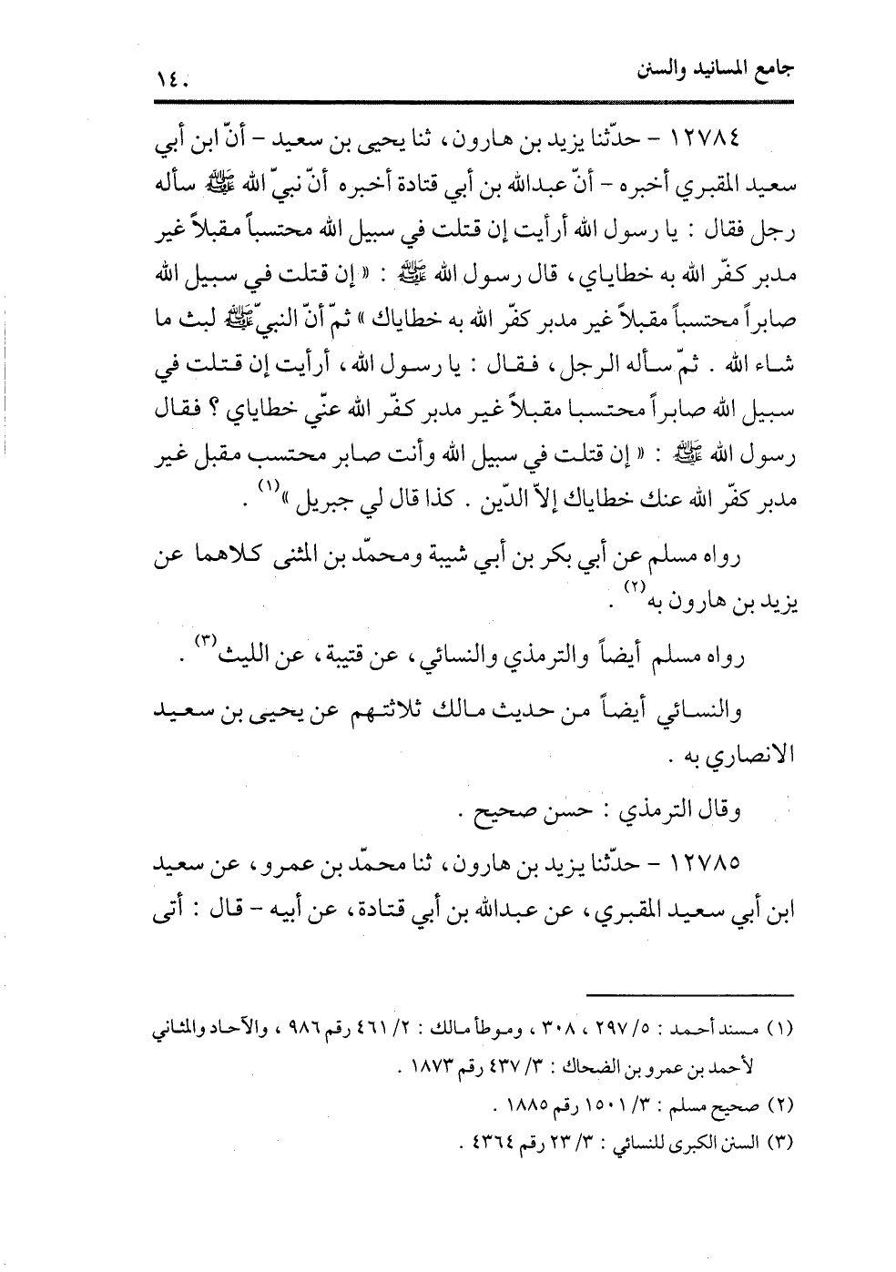 12784 - حدثنا يزيد بن هارون، ثنا يحيى بن سعيد - أن ابن أبي سعيد المقبري أخبره - أن عبد الله بن أبي قتادة أخبره أن نبي الله - صلى الله عليه وسلم - سأله رجل فقال: يارسول الله أرأيت إن قتلت في سبيل الله محتسباً مقبلاً غير مدبر كفر الله به خطاياي، قال رسول الله - صلى الله عليه وسلم -: ((إن قتلت في سبيل الله صابراً محتسباً مقبلاً غير مدبر كفر الله به خطاياك)) ثم أن النبي - صلى الله عليه وسلم - لبث ماشاء الله. ثم سأله الرجل، فقال: يارسول الله، أرأيت إن قتلت في سبيل الله صابراً محتسباً مقبلاً غير مدبر كفر الله عني خطاياي؟ فقال رسول الله - صلى الله عليه وسلم -: ((إن قتلت في سبيل الله وأنت صار محتسب مقبل غير مدبر كفر الله عنك خطاياك إلا الدين. كذا قال لي جبريل)) (¬1) .