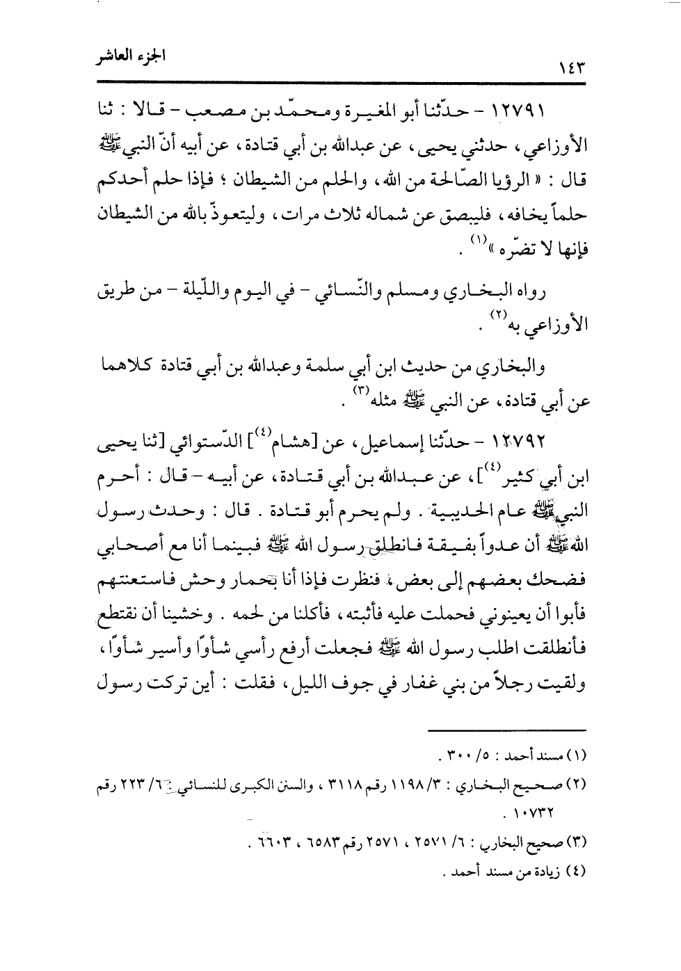 12792 - حدثنا إسماعيل، عن [هشام] (¬4) الدستوائي [ثنا يحيى بن أبي كثير] (¬5) ، عن عبد الله بن أبي قتادة، عن أبيه -قال: أحرم النبي - صلى الله عليه وسلم - عام الحديبية. ولم يحرم أبو قتادة. قال: وحدث رسول الله - صلى الله عليه وسلم - أن عدواً بفيقة فانطلق رسول الله - صلى الله عليه وسلم - فبينما أنا مع أصحابي فضحك بعضهم إلى بعض، فنظرت فإذا أنا بحمار وحش فاستعنتهم فأبوا أن يعينوني فحملت عليه فأثبته، فأكلنا من لحمه. وخشينا أن نقتطع فانطلقت أطلب رسول الله - صلى الله عليه وسلم - فجعلت أرفع رأسي شأوا وأسير شأواً، ولقيت رجلاً من بني غفار في جوف الليل، فقلت: أين تركت رسول