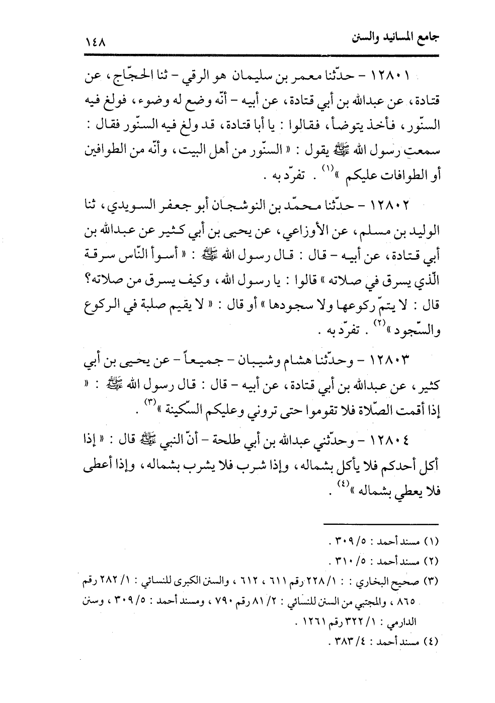 12802 - حدثنا محمد بن النوشجان أبو جعفر السويدي، ثنا الوليد بن مسلم، عن الأوزاعي، عن يحيى بن أبي كثير عن عبد الله بن أبي قتادة، عن أبيه -قال: قال رسول الله - صلى الله عليه وسلم -: ((أسوأ الناس سرقة الذي يسرق في صلاته)) قالوا: يارسول الله، وكيف يسرق من صلاته؟ قال: لايتم ركوعها ولاسجودها)) أو قال: ((لايقيم صلبه في الركوع والسجود)) (¬2) . تفرد به.