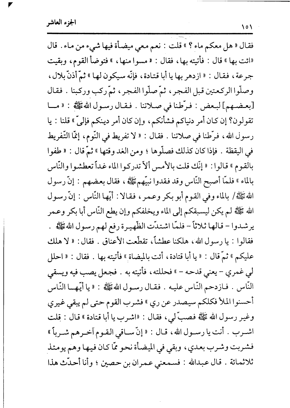 فإذا كان كذلك فصلوها؛ ومن الغد وقتها)) ثم قال: ((طفوا بالقوم)) قالوا: ((إنك قلت بالأمس ألا تدركوا الماء غداً تعطشوا والناس بالماء)) فلما أصبح الناس وقد فقدوا نبيهم - صلى الله عليه وسلم -، فقال بعضهم: إن رسول الله - صلى الله عليه وسلم - / بالماء وفي القوم أبو بكر وعمر، فقالا: أيها الناس: إن رسول الله - صلى الله عليه وسلم - لم يكن ليسبقكم إلى الماء ويخلفكم وإن يطع الناس أبا بكر وعمر يرشدوا -قالها ثلاثاً- فلما اشتدت الظهيرة رفع لهم رسول الله - صلى الله عليه وسلم -. فقالوا: يارسول الله، هلكنا عطشاً، تقطعت الأعناق. فقال: ((لاهلك عليكم)) ثم قال: ((ياأبا قتادة، أئت بالميضاة)) فأتيته بها. فقال: ((احلل لي غمري -يعني قدحه-)) فحللته، فأتيته به. فجعل يصب فيه ويسقي الناس. فازدحم الناس عليه. فقال رسول الله - صلى الله عليه وسلم -: ((ياأيها الناس أحسنوا الملأ فكلكم سيصدر عن ري)) فشرب القوم حتى لم يبقى غيري وغير رسول الله - صلى الله عليه وسلم - فصب لي، فقال: ((اشرب ياأبا قتادة)) قال: قلت اشرب. أنت يارسول الله، قال: ((إن ساقي القوم آخرهم شرباً)) فشربت وشرب بعدي، وبقي في الميضأة نحو مما كان فيها وهم يومئذ ثلاثمائة. قال عبد الله: فسمعني عمران بن حصين؛ وأنا أحدث هذا