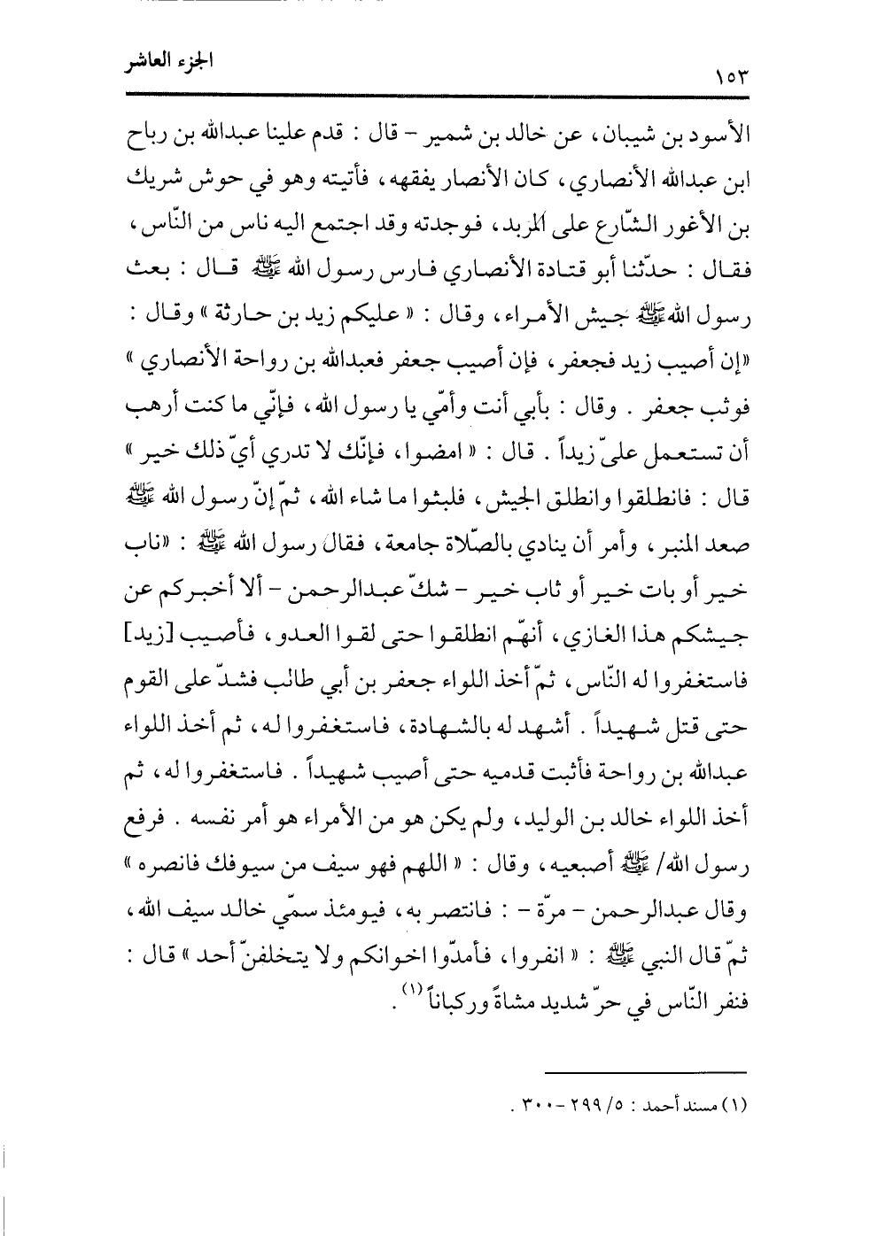 كان الأنصار يفقهه، فتيته وهو في حوش شريك بن الأغور الشارع على المربد، فوجدته وقد اجتمع إليه ناس من الناس، فقال: حدثنا أبو قتادة الأنصاري فارس رسول الله - صلى الله عليه وسلم - قال: بعث رسول الله - صلى الله عليه وسلم - جيش الأمراء، وقال: ((عليكم زيد بن حارثة)) وقال: ((إن أصيب زيد فجعفر، فإن أصيب جعفر فعبد الله بن رواحة الأنصاري)) فوثب جعفر. وقال: بأبي أنت وأمي يارسول الله، فإني ماكنت أرهب أن تستعمل عليّ زيداً. قال: ((امضوا، فإنك لاتدري أي ذلك خير)) قال: فانطلقوا وانطلق الجيش، فلبثوا ماشاء الله، ثم إن رسول الله - صلى الله عليه وسلم - صعد المنبر، وأمر أن ينادي بالصلاة جامعة، فقال رسول الله - صلى الله عليه وسلم -: ((ناب خير أو بات خير أو ثاب خير -شك عبد الرحمن- ألا أخبركم عن جيشكم هذا الغازي، إنهم انطلقوا حتى لقوا العدو، فأصيب [زيد] فاستغفروا له الناس، ثم أخذ اللواء جعفر بن أبي طالب فشد على القوم حتى قتل شهيداً. أشهد له بالشهادة، فاستغفروا له، ثم أخذ اللواء عبد الله بن رواحة فأثبت قدميه حتى أصيب شهيداً. فاستغفروا له، ثم أخذ اللواء خالد بن الوليد، ولم يكن هو من الأمراء هو أمر نفسه. فرفع رسول الله/ - صلى الله عليه وسلم - أصبعيه، وقال: ((اللهم فهو سيف من سيوفك فانصره)) وقال عبد الرحمن -مرة-: فانتصر به، فيومئذ سمي خالد سيف الله، ثم قال النبي - صلى الله عليه وسلم -: ((انفروا، فأمدوا إخوانكم ولايتخلفن أحد)) قال: فنفر الناس في حر شديد مشاةً وركباناً (¬1) .