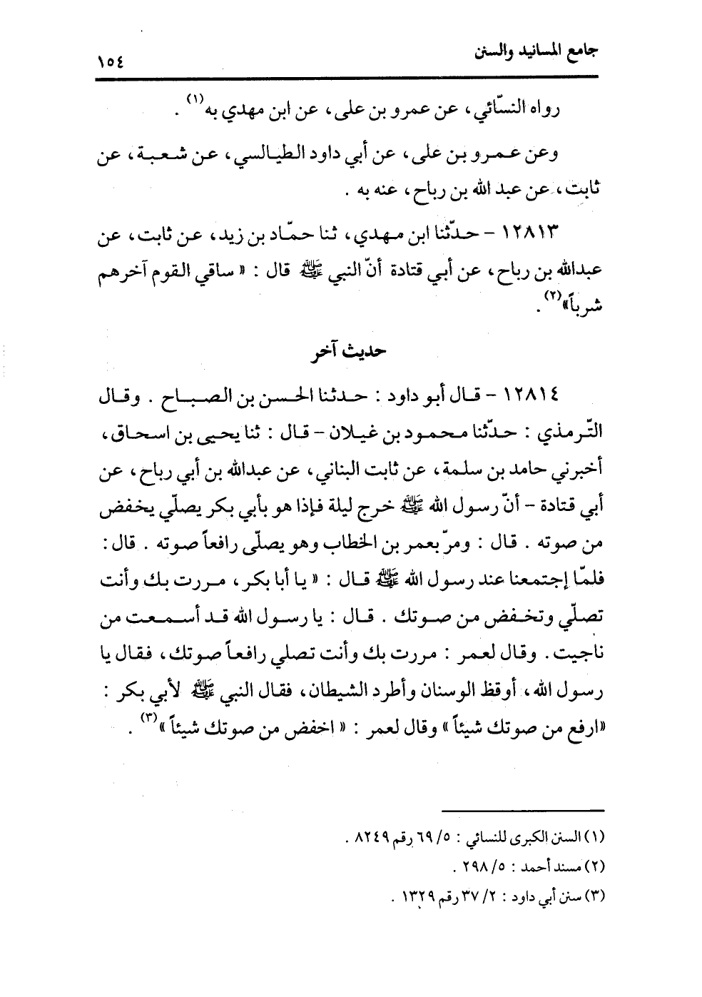 12814 - قال أبو داود: حدثنا الحسن بن الصباح. وقال الترمذي: حدثنا محمود بن غيلان -قال: ثنا يحيى بن إسحاق، أخبرني حامد بن سلمة، عن ثابت البناني، عن عبد الله بن أبي رباح، عن أبي قتادة -أن رسول الله - صلى الله عليه وسلم - خرج ليلة فإذا هو بأبي بكر يصلي يخفض من صوته. قال: ومر بعمر بن الخطاب وهو يصلي رافعاً صوته. قال: فلما اجتمعنا عند رسول الله - صلى الله عليه وسلم - قال: ((ياأبا بكر، مررت بك وأنت تصلي وتخفض من صوتك. قال: يارسول الله قد أسمعت من ناجيت. وقال لعمر: مررت بك وأنت تصلي رافعاً صوتك، فقال يارسول الله، أوقظ الوسنان وأطرد الشيطان، فقال النبي - صلى الله عليه وسلم - لأبي بكر: ((ارفع من صوتك شيئاً)) وقال لعمر: ((اخفض من صوتك شيئاً)) (¬2) .