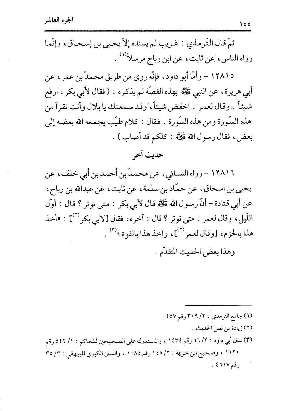 12816 - رواه النسائي، عن محمد بن أحمد بن أبي خلف، عن يحيى بن إسحاق، عن حماد بن سلمة، عن ثابت، عن عبد الله بن رباح، عن أبي قتادة -أن رسول الله - صلى الله عليه وسلم - قال لأبي بكر: متى توتر؟ قال: أول الليل، وقال لعمر: متى توتر؟ قال: آخره، فقال [[لأبي بكر] (¬1) : ((أخذ هذا بالحزم، [وقال لعمر] (¬2) ، وأخذ هذا بالقوة)) (¬3) .