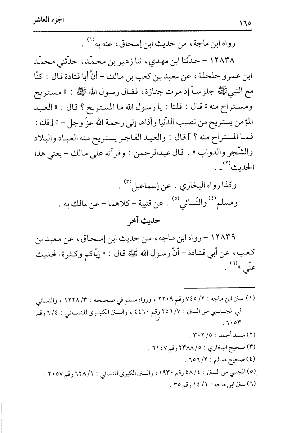 12838 - حدثنا ابن مهدي، ثنا زهير بن محمد، حدثني محمد بن عمرو حلحلة، عن معبد بن كعب بن مالك - أنَّ أبا قتادة قال: كنا مع النبي - صلى الله عليه وسلم - جلوساً إذ مرت جنازة، فقال رسول الله - صلى الله عليه وسلم -: ((مستريح ومستراح منه)) قال: قلنا: يارسول الله ماالمستريح؟ قال: ((العبد المؤمن يستريح من نصيب الدنيا وأذاها إلى رحمة الله عز وجل-)) [قلنا: فما المستراح منه؟] قال: والعبد الفاجر يستريح منه العباد والبلاد والشجر والدواب)) . قال عبد الرحمن: وقرأته على مالك - يعني هذا الحديث (¬1) .
