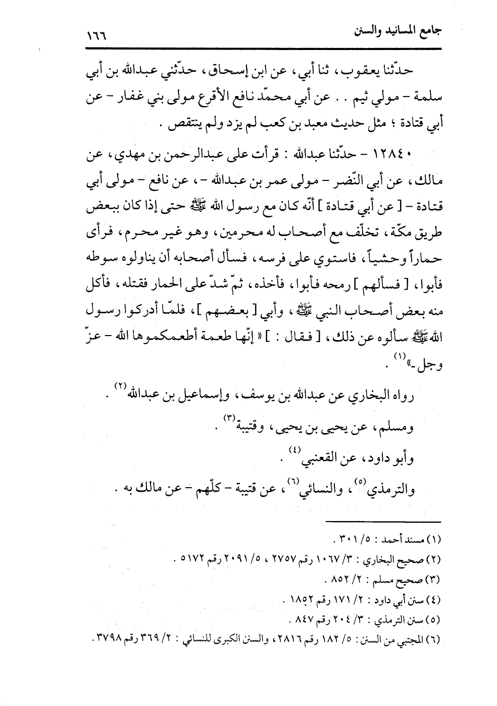 12840 - حدثنا عبد الله: قرأت على عبد الرحمن بن مهدي، عن مالك، عن أبي النضر -مولى عمر بن عبد الله-، عن نافع - مولى أبي قتادة-[عن أبي قتادة] أنه كان مع رسول الله - صلى الله عليه وسلم - حتى إذا كان ببعض طريق مكة، تخلف مع أصحاب له محرمين، وهو غير محرم، فرأى حماراً وحشياً، فاستوى على فرسه، فسأل أصحابه أن يناولوه سوطه فابوا، [فسألهم] رمحه فأبوا، فأخذه، ثم شد على الحمار فقتله، فأكل منه بعض أصحاب النبي - صلى الله عليه وسلم -، وأبي [بعضهم] ، فلما أدركوا رسول الله - صلى الله عليه وسلم - سألوه عن ذلك، [فقال:] ((إنها طعمة أطعمكموها الله - عز وجل-)) (¬1) .
