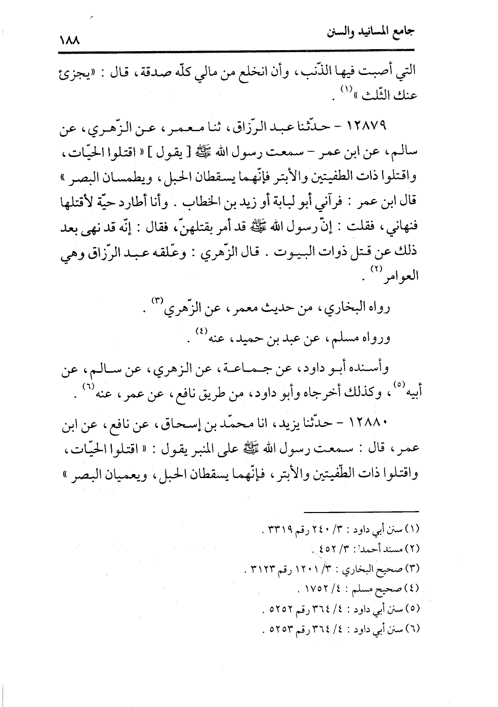 12879 - حدثنا عبد الرزاق، ثنا معمر، عن الزهري، عن سالم، عن ابن عمر -سمعت رسول الله - صلى الله عليه وسلم -[يقول] ((اقتلوا الحيات، واقتلوا ذات الطفيتين والأبتر فإنهما يسقطان الحبل، ويطمسان البصر)) قال ابن عمر: فرآني أبو لبابة أو زيد بن الخطاب. وأنا أطارد حية لأقتلها فنهاني، فقلت: إن رسول الله - صلى الله عليه وسلم - قد أمر بقتلهن، فقال: إنه قد نهى بعد ذلك عن قتل ذوات البيوت. قال الزهري: وعلقه عبد الرزاق وهي العوامر (¬1) .
